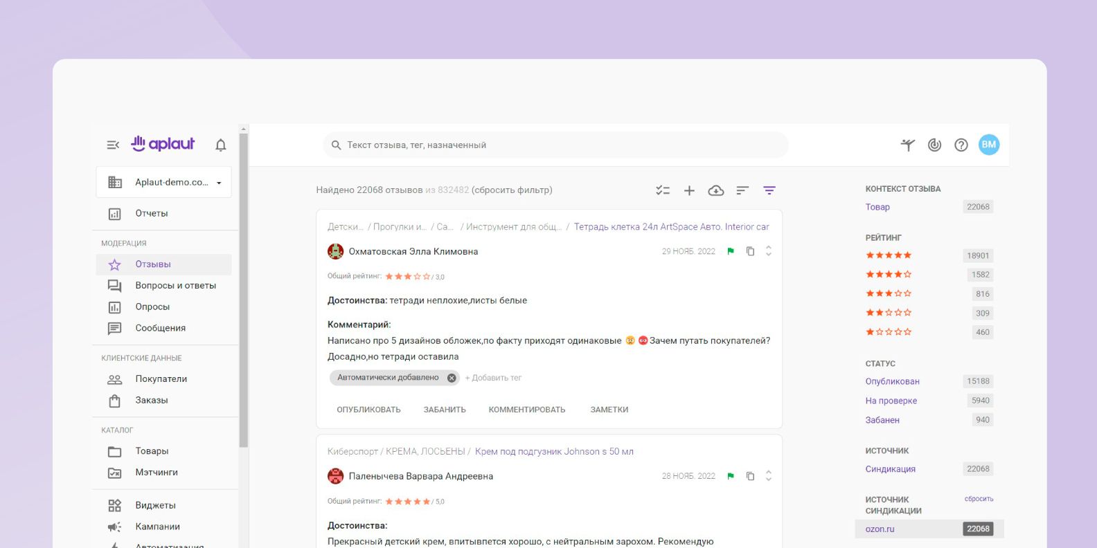 Мы на регулярной основе собираем на платформе все новые отзывы на ваши товары, и они автоматически поступают в раздел “Отзывы” личного кабинета вашей компании на платформе Aplaut.
