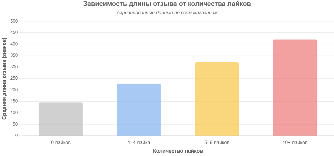 Из наших исследований мы чётко видим, что чем длиннее отзыв, тем больше людей считают его полезным. Отзывы с 10+ лайками в среднем почти в три раза длинней нулевых. Мы ограничились длиной в 500+ символов просто потому что более длинных отзывов недостаточно для сравнения.