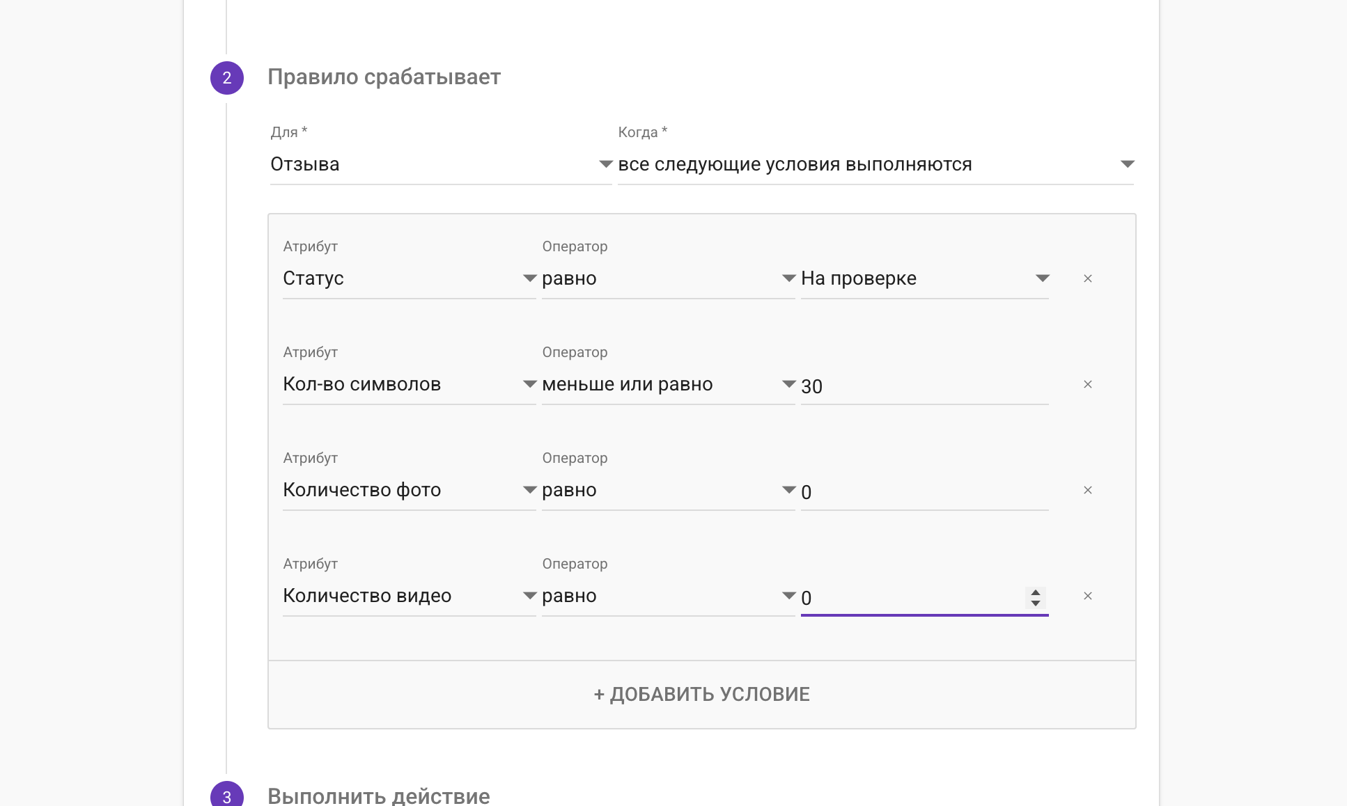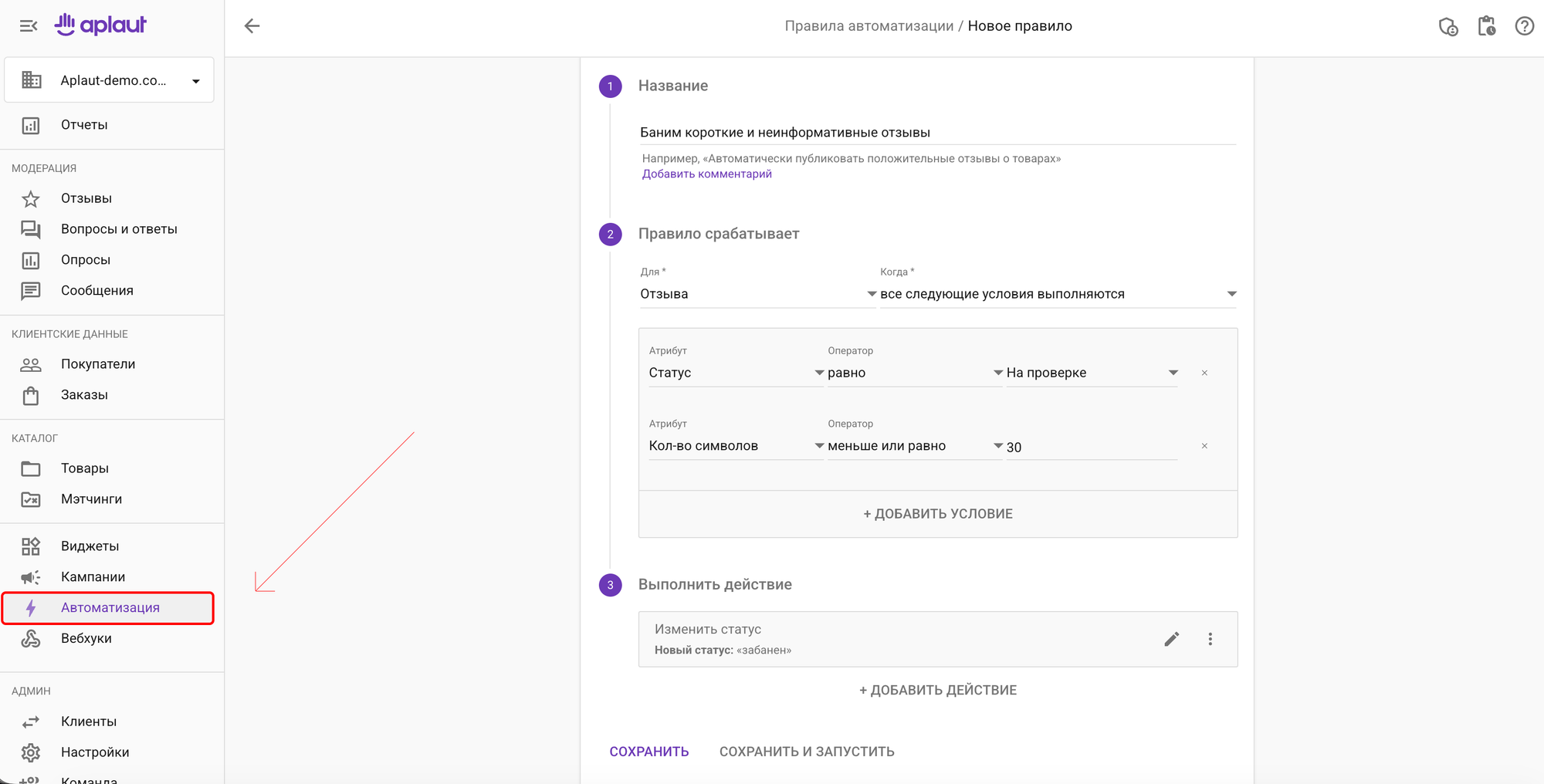 Открываем личный кабинет, идем в раздел Настройки → Автоматизация → Правила автоматизации → Новое правило и задаем рамки для коротких текстов.