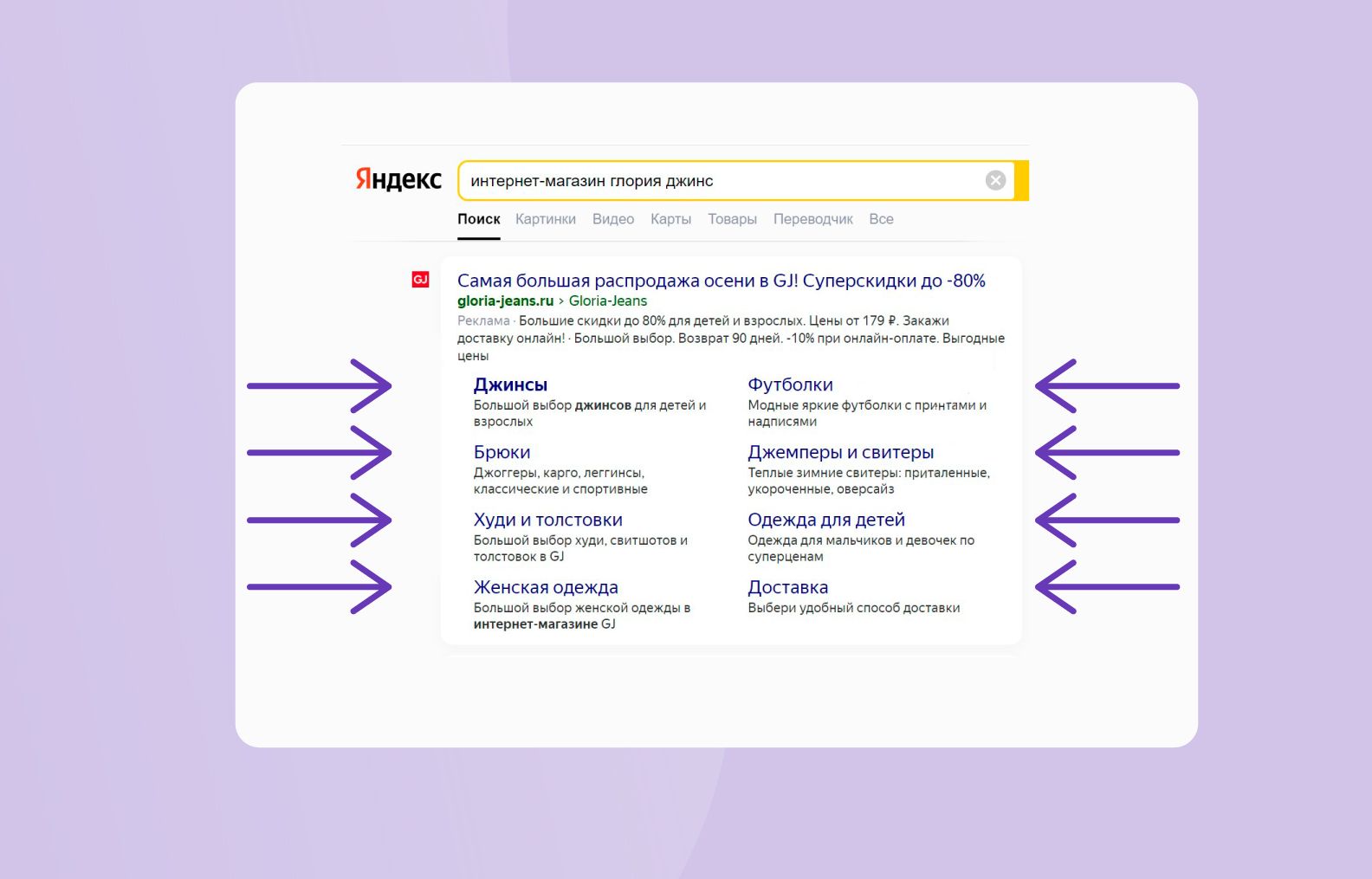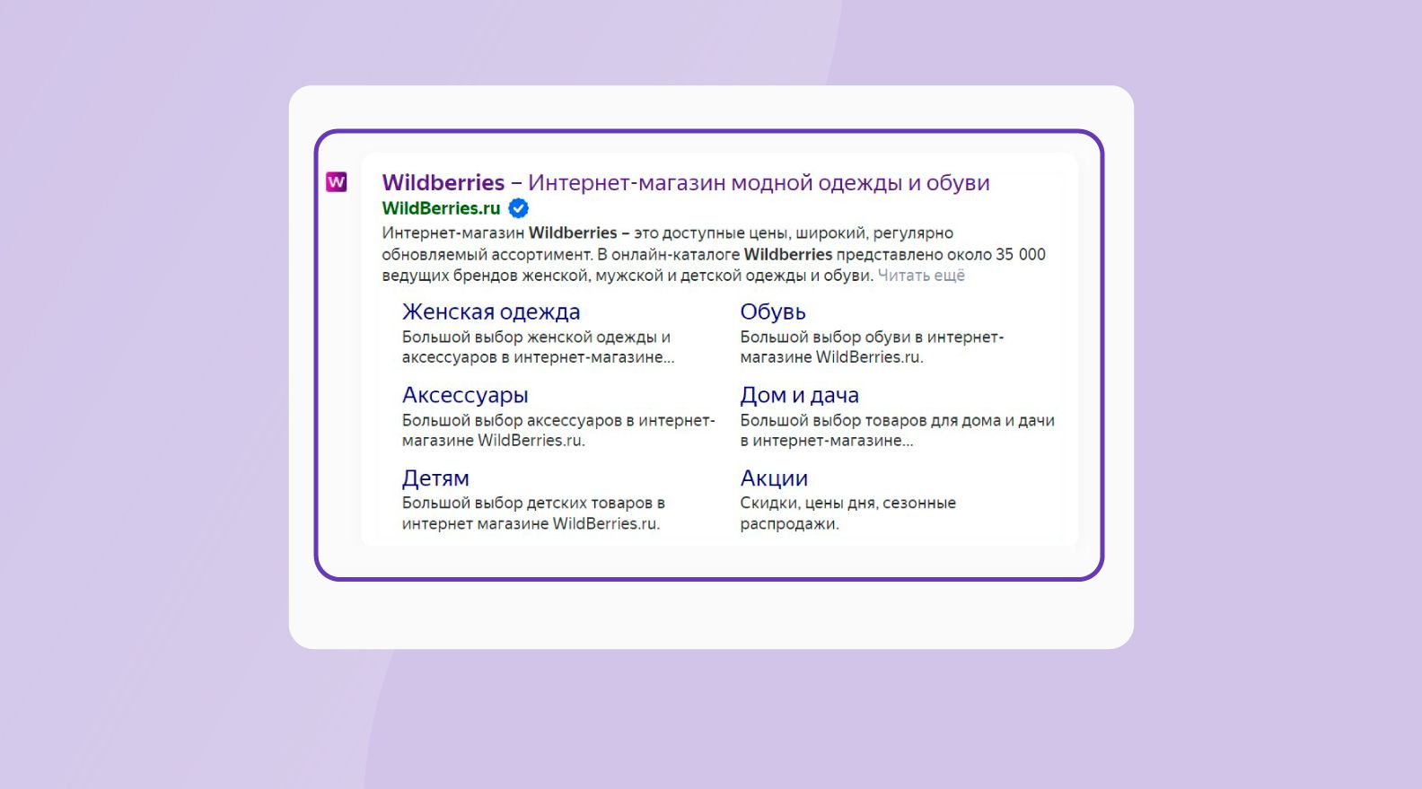 Ссылки очень полезны в сниппетах интернет-магазинов, так как побуждают пользователей кликать по ним, и дают возможность переходить непосредственно в ту категорию, которая интересна покупателю. В расширенном сниппете может содержаться до 8 ссылок с кратким описанием разделов.