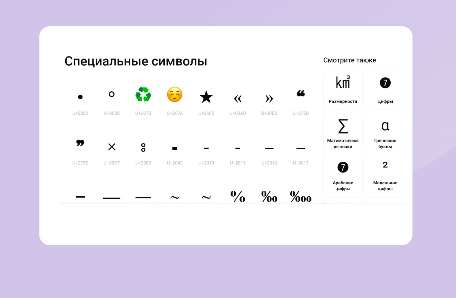 Полный набор возможных спецсимволов, которые можно использовать в расширенном сниппете, собран в таблице символов Юникода.