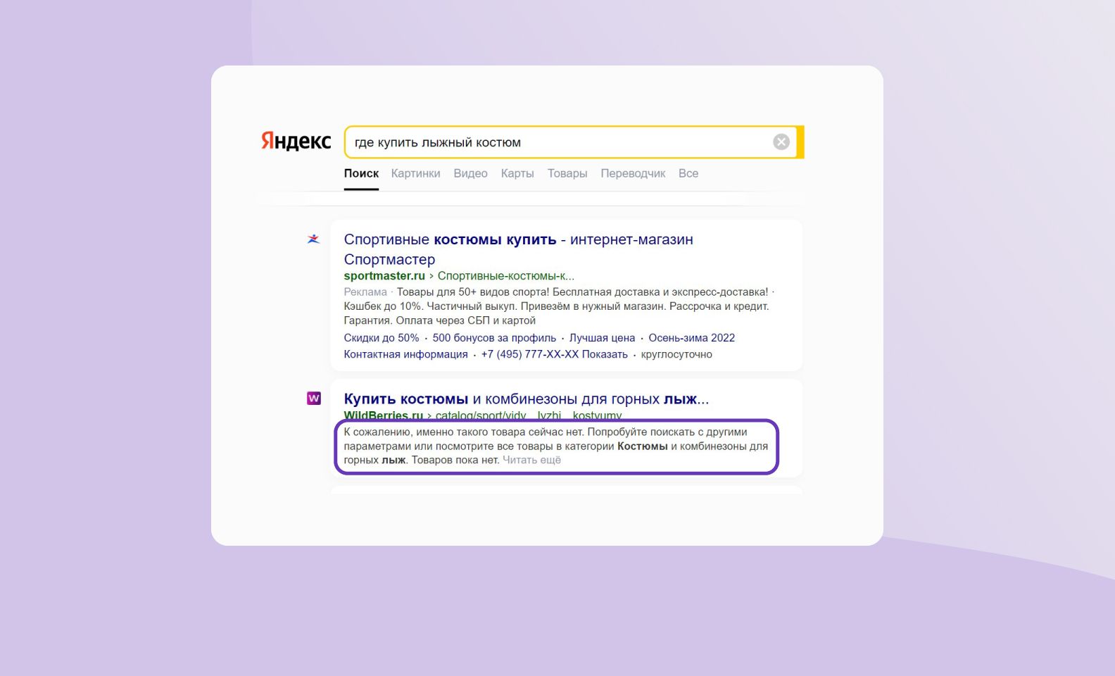7.Используйте нестандартные сниппеты для страниц временно отсутствующих товаров. Это не поможет продавать здесь и сейчас — так как продавать нечего — но усилит доверие к вам как к продавцу благодаря тому, что вы позаботились о пользователе и не повели его на страницу товара, которого нет.