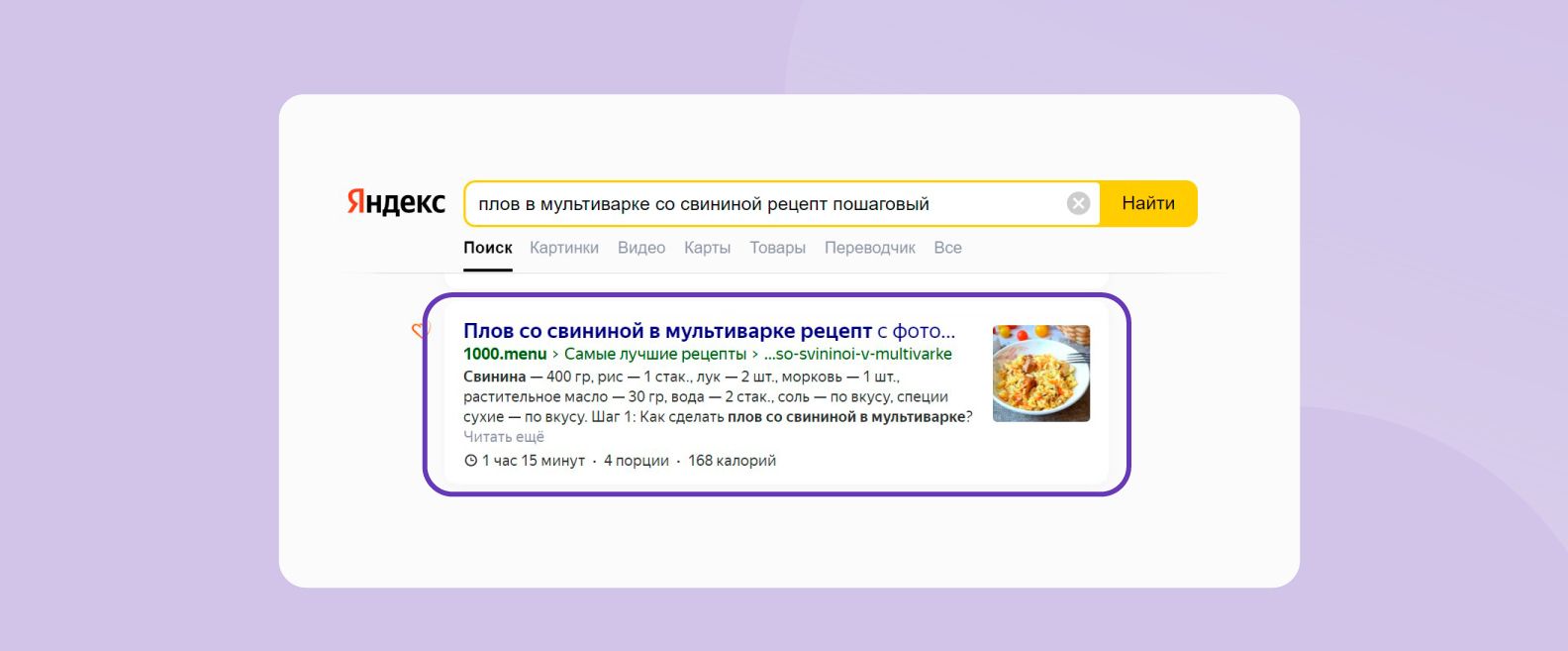 - Учитывать, что поисковые системы любят выводит сниппеты с картинками на поиске в рецептах или инструкциях. Например, в инструкции по использованию сложного товара.