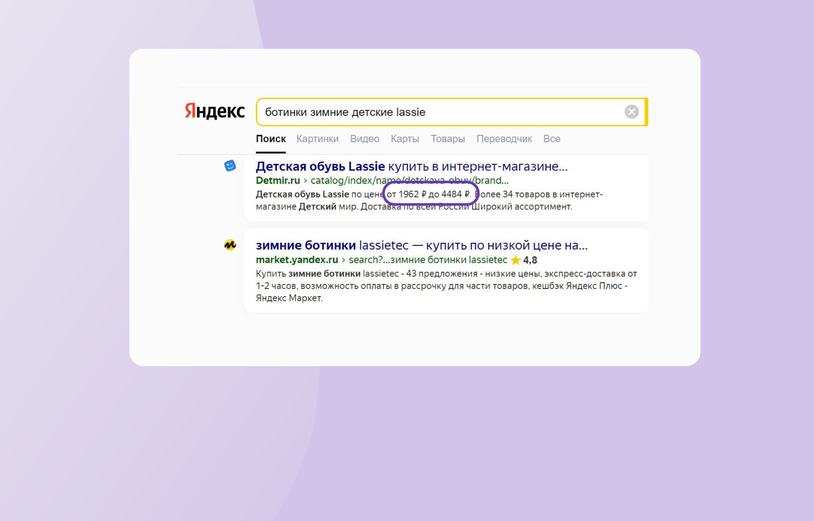Цены в расширенном сниппете могут показывать и Яндекс, и Google, и цены, несомненно, делают сниппет более информативным и более привлекательным. Цена попадает в расширенный сниппет в случаях, когда страница показывается в поисковой выдаче как ответ на запрос покупателя о конкретном товаре или конкретном бренде.