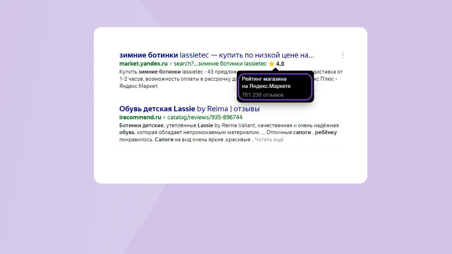 Рейтинги могут отображаться в обеих поисковых системах в виде звездочек: чем выше оценка пользователей, тем больше доверия к сайту. Поисковые системы могут выводить в расширенном сниппете рейтинги продавца на «Яндекс.Маркете» для Яндекса, и рейтинг сайта с Google Maps в Google.