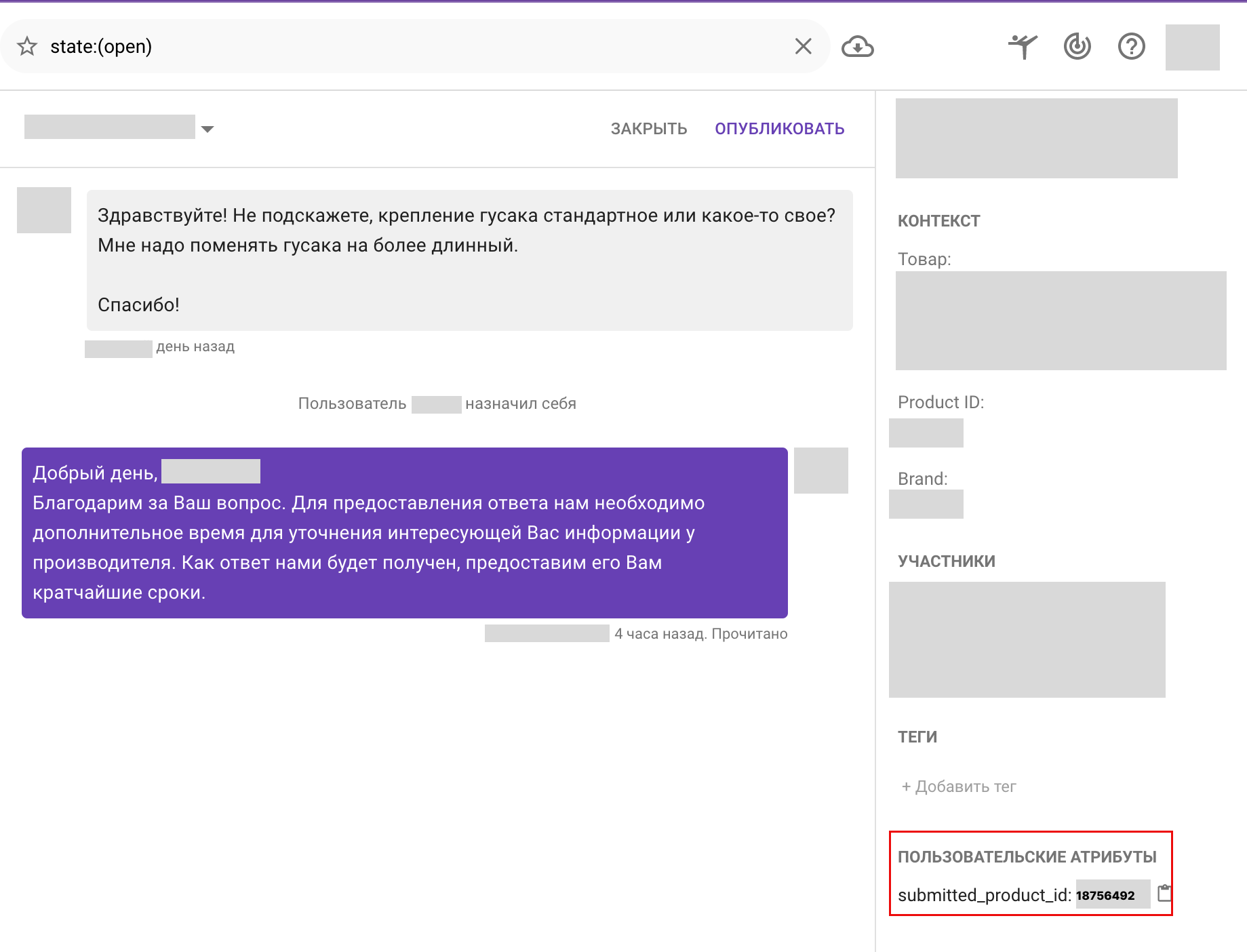 Диалоги, открытые без привязки к товару, теперь автоматически привяжутся к нему в течение 7 дней: как только товар появится в каталоге. На вопросы пользователей стало легче отвечать: сразу понятно, о каком товаре идет речь, даже если он отсутствует в каталоге. Это стало возможным благодаря отображению пользовательского атрибута в окне диалога.