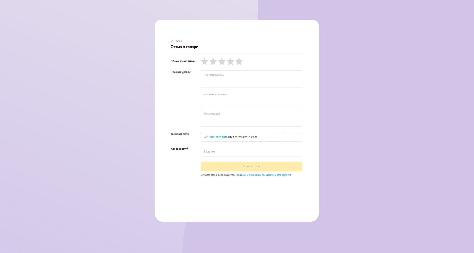 Чтобы не упускать возможность получить отзывы без дополнительных усилий, сделайте процесс интуитивно понятным: добавьте в форму понятные текстовые поля и шкалы оценок, соответствующие специфики товаров.