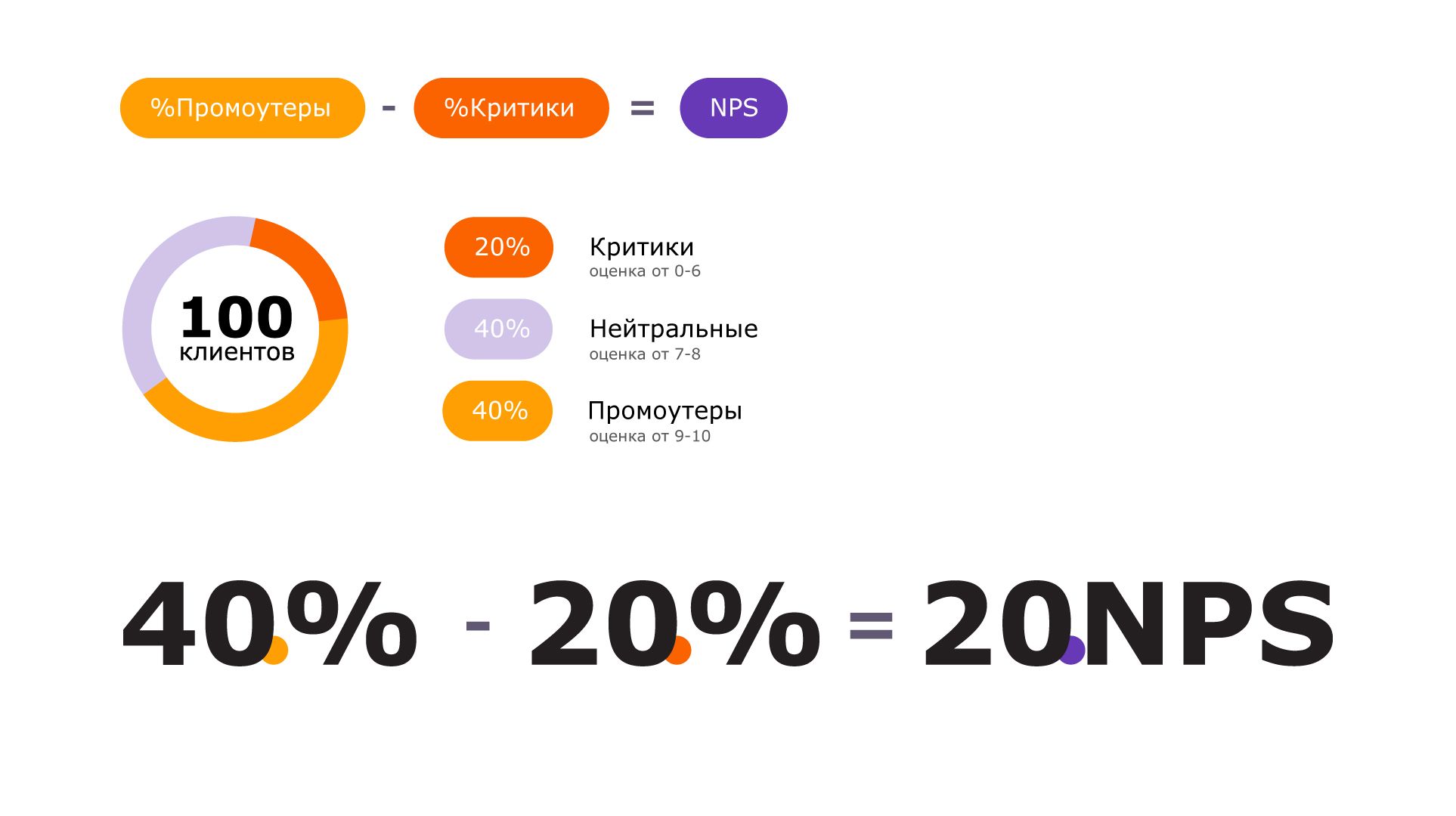 40% (Промоутеры) – 20% (Критики) = 20 (NPS).