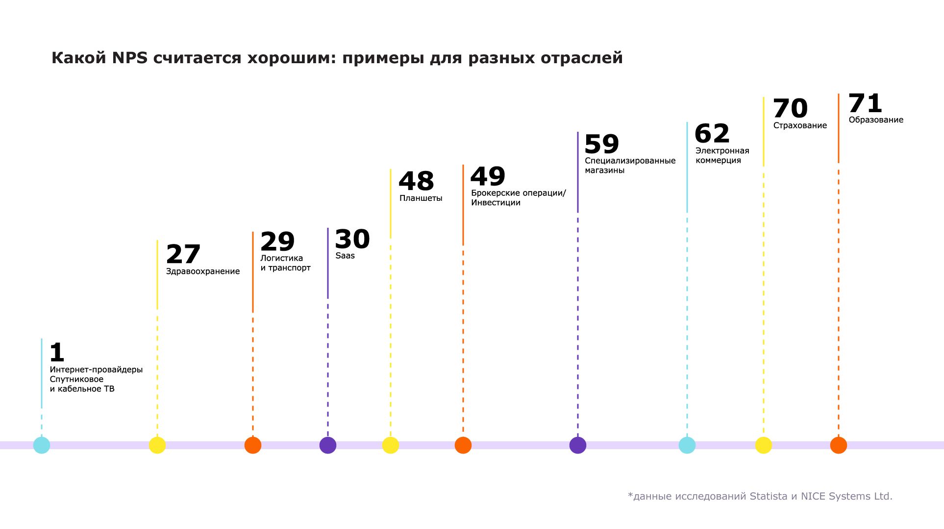 Для определения средних показателей NPS по отраслям регулярно проводятся исследования. Например, по данным Statista за 2020 год, самый высокий NPS в среднем в мире показывают компании из категорий “Образование” (71), “Страхование” (70) и “Электронная коммерция” (62) а самые низкие – Saas (30), “Логистика и транспорт (29) и “Здравоохранение” (27).