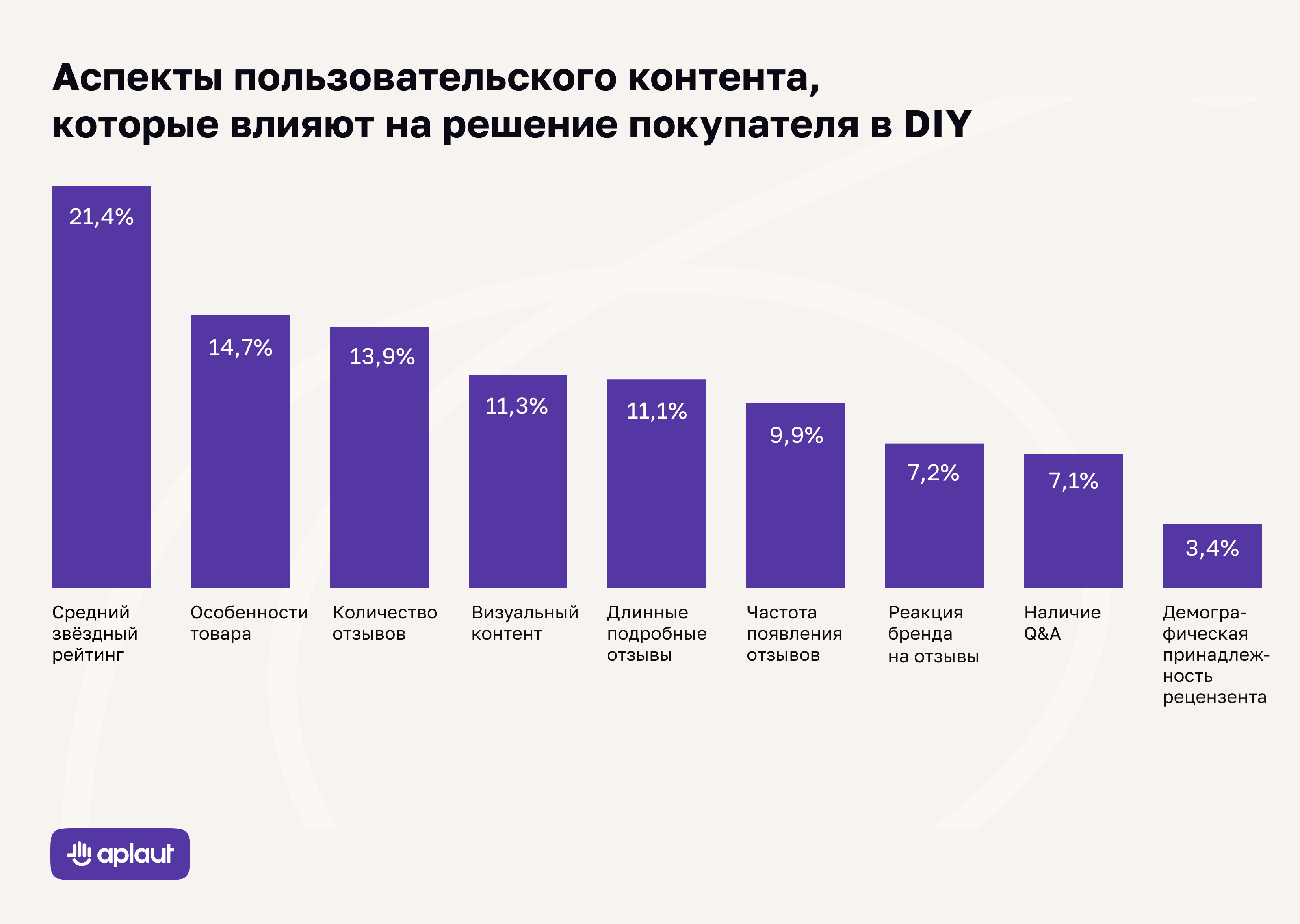 Исследования показывают, что отзывы и рейтинги особенно важны для новичков в DIY. 80% потребителей в России покупают товары новых для себя производителей — они легко меняют свои предпочтения, переходя от одного бренда к другому. В таких условиях отзывы становятся важным ориентиром, помогая оценить качество и надёжность новых товаров.