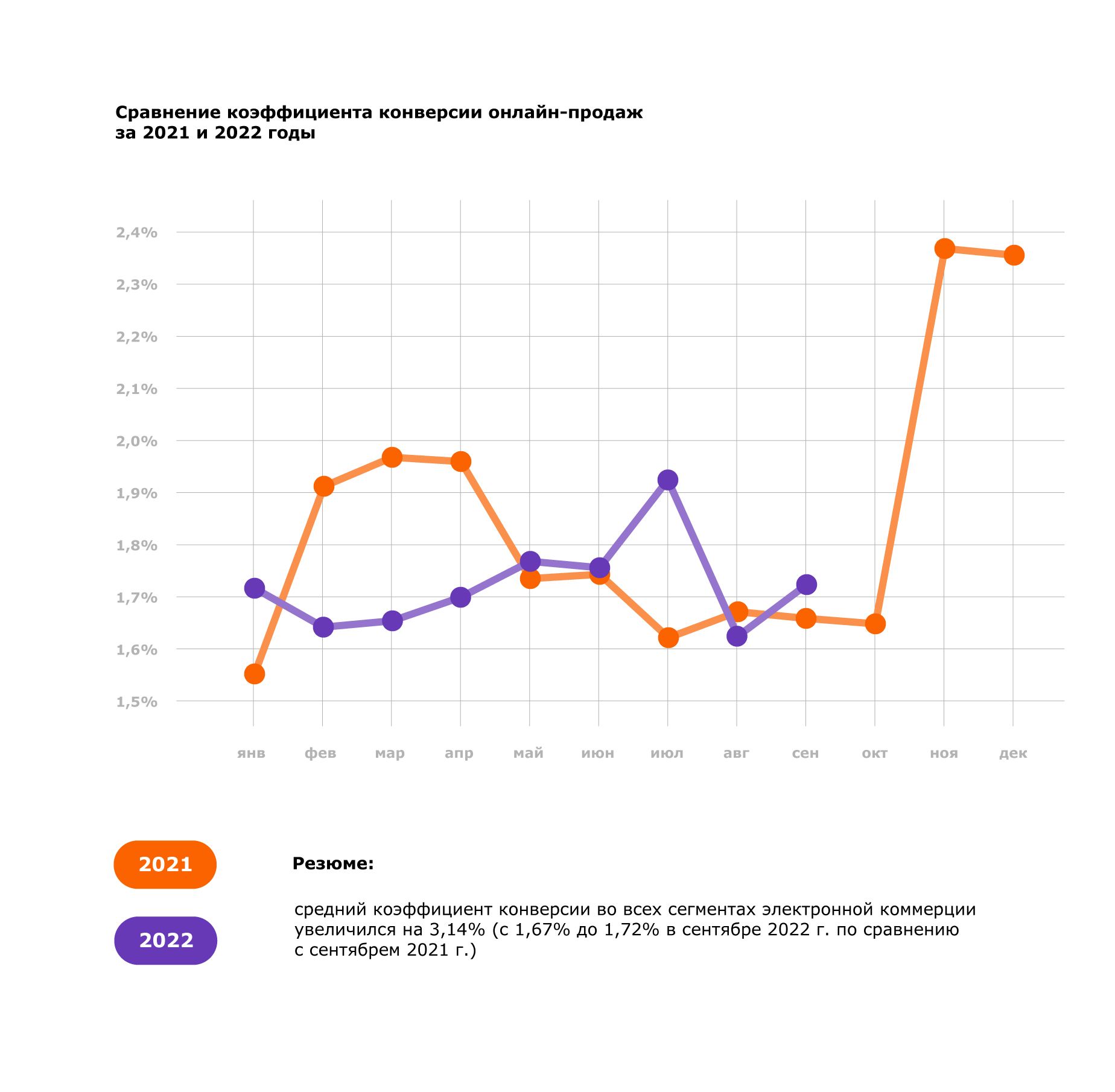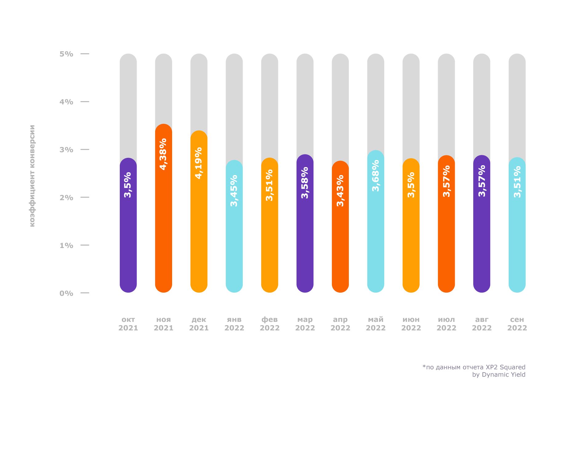 Итак, вы посчитали конверсию (CR) вашего сайта. Но как понять, может ли она считаться хорошей? Для ориентира можно использовать средние показатели по вашей отрасли. Например, для интернет-магазинов в среднем хорошей считается CR 2-5%. По данным отчета XP2 Squared by Dynamic Yield, средняя конверсия в электронной коммерции по всему миру с октября 2021 по сентябрь 2022 составила 3,69%.