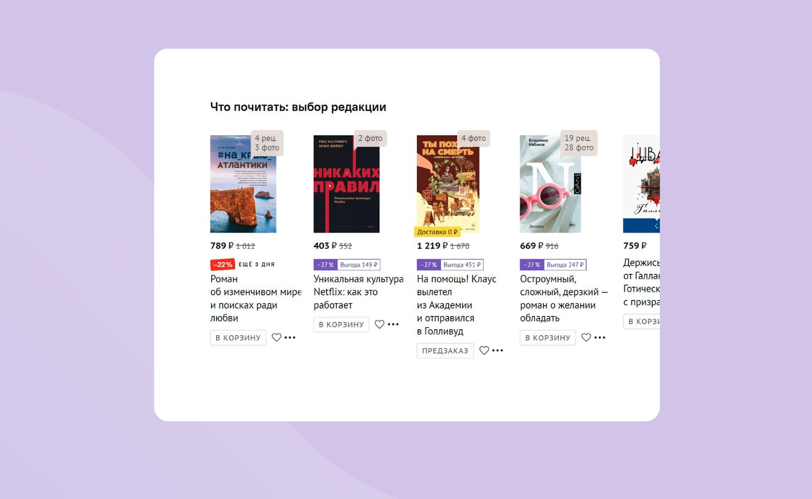 Один из эффективных способов борьбы с эффектом слишком широкого выбора — подборки, рейтинги и рекомендации. Если товары объединены вместе по какому-то понятному принципу, да к тому же их еще и рекомендуют эксперты или другие покупатели — вероятность покупки значительно повышается. Вот как оформлена подборка «Выбор редакции» в книжном магазине Labirint.ru.