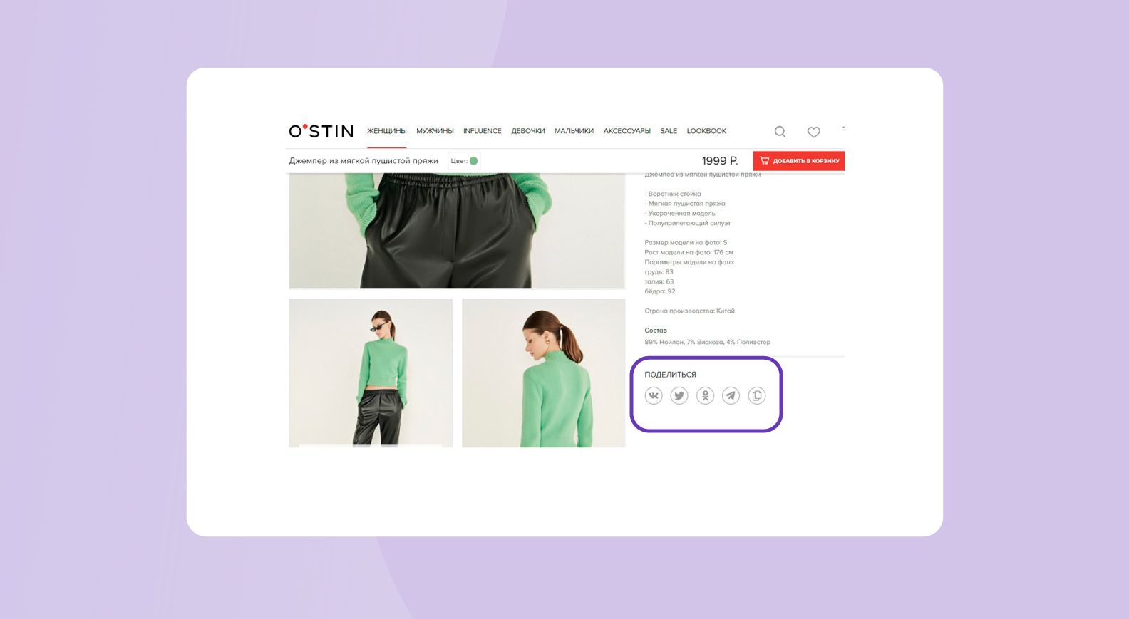 Возможно, ваш товар не подойдет пользователю, но зато отлично подойдет его или ее другу или подруге; есть и те, кому надо обсудить покупку — например, подарок. В этом случае пригодится возможность поделиться страницей товара в соцсетях и мессенджерах в один клик с помощью соответствующей кнопки. Можно также добавить кнопку «копировать ссылку», как сделали в интернет-магазине Ostin.