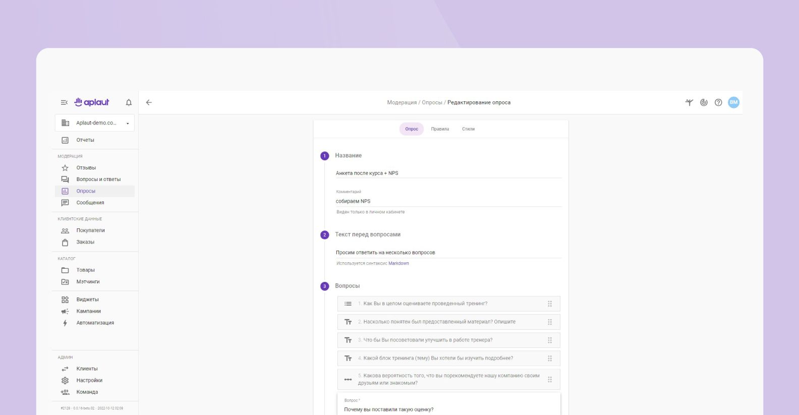 К тому же, такие опросы можно практически полностью автоматизировать. Например, платформа Aplaut позволяет быстро создавать опросы для определения метрик NPS, CSAT и CSI с помощью конструктора анкет, настроить логику опроса и триггеры для рассылки, выгрузить статистику и не только. Благодаря этому вы сможете сэкономить время на подготовку и сосредоточиться главном — корректировке вашей маркетинговой стратегии на основании результатов опросов.