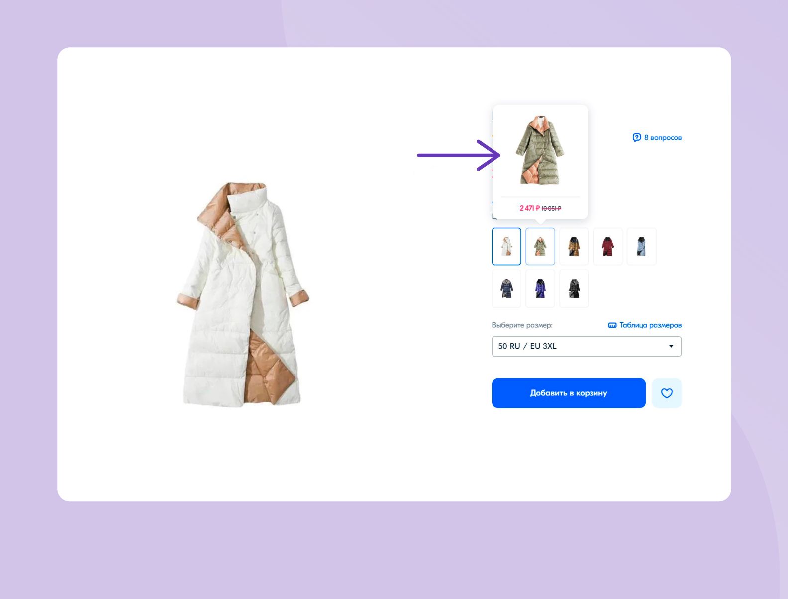Один и тот же товар может быть разного цвета, размера, комплектации. Процесс выбора опций должен быть понятным и простым. Например, при наличии разных расцветок одного и того же товара можно сделать функцию увеличения фото без кликов, чтобы пользователь не совершал лишних действий.