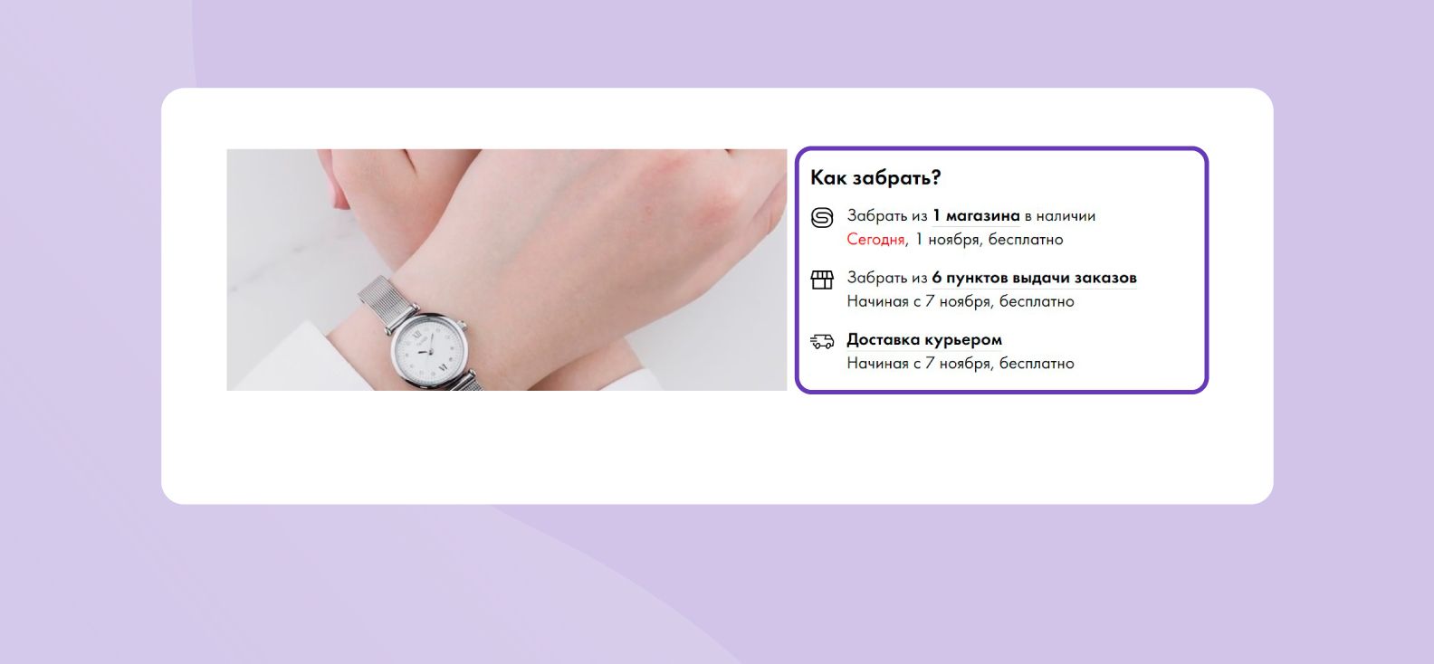 Логично если товарная карточка содержит основную информацию о доставке и гарантиях. Зная эти детали, человеку легче будет сделать выбор и принять решение о покупке. Конечно, отдельной страницы о доставке и возможности возврата информация в карточке не заменит, но сделает товарное предложение более убедительным. Так, срок доставки в ряде случаев может быть определяющим фактором.