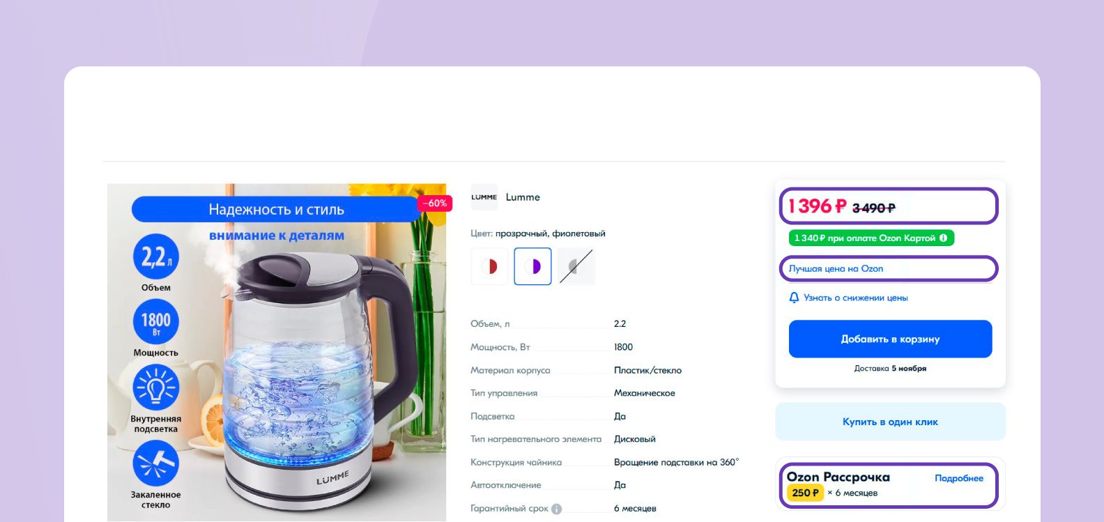Цена очень часто становится финальным фактором, который влияет на решение о покупке. В правильной товарной карточке она должна быть заметной, крупной, контрастной. И актуальной — если при попытке оформить заказ или при звонке менеджеру цена будет меняться, это станет крайне негативным клиентским опытом.