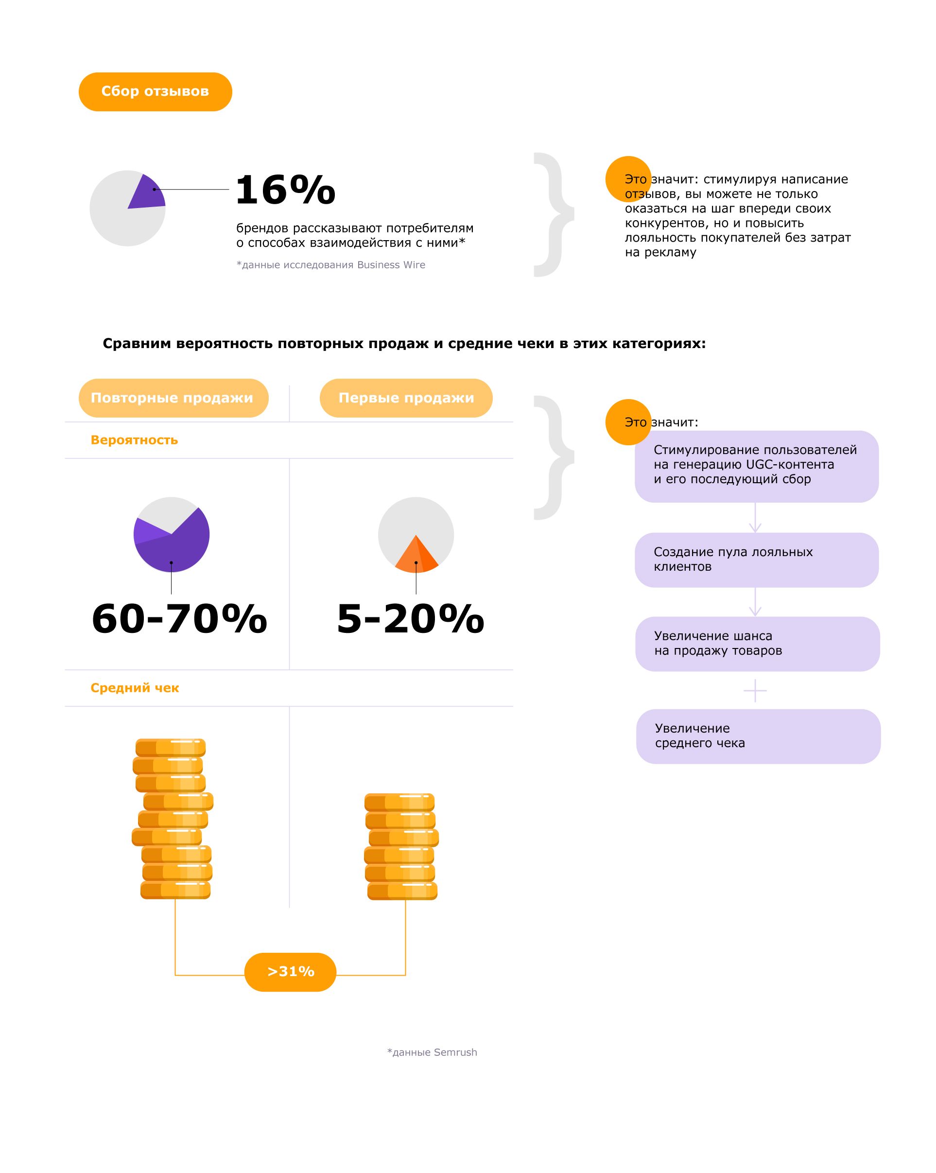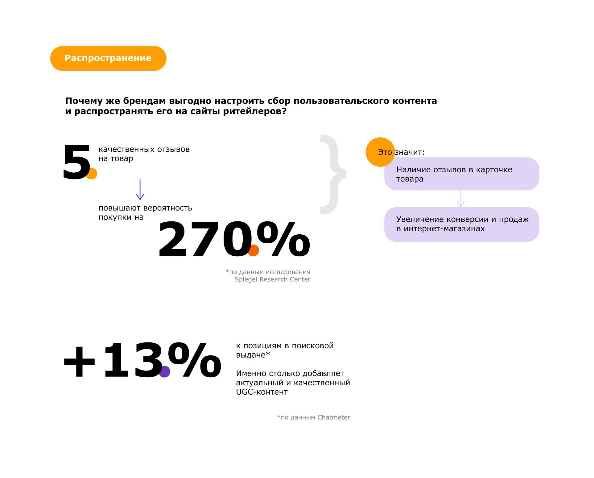 Наличие отзывов в карточке товара повышает конверсию и продажи в интернет-магазинах: по данным исследования Spiegel Research Center, наличие как минимум пяти качественных отзывов на товар может повысить вероятность покупки на 270%. Поэтому брендам выгодно настроить сбор пользовательского контента и распространение его на сайты ритейлеров.