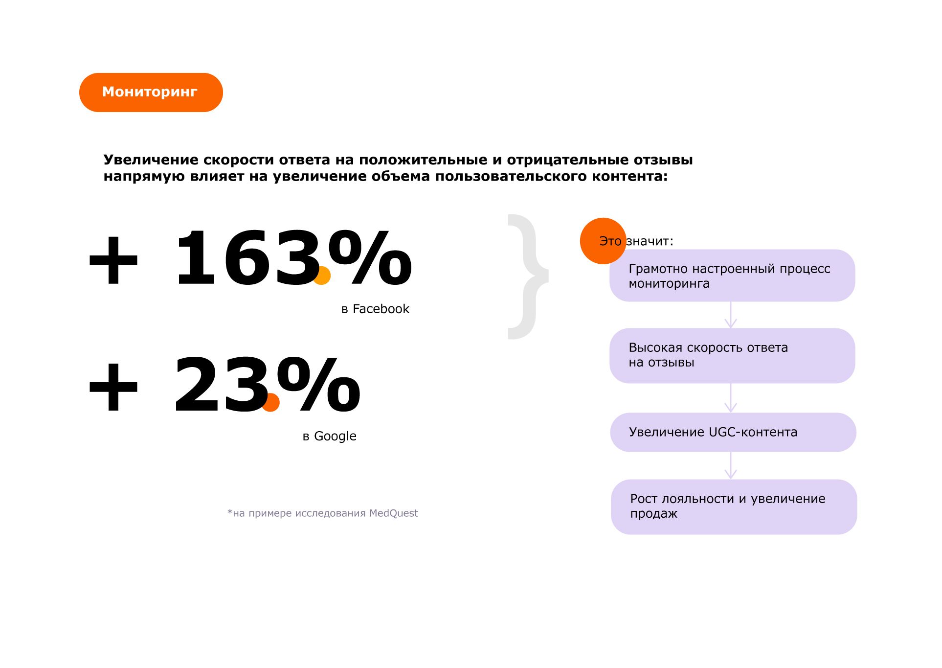 Важность оперативности коммуникаций с потребителями подтверждает пример MedQuest. После увеличения скорости ответа на положительные и отрицательные отзывы объем пользовательского контента в Facebook (принадлежат Meta, признана в России запрещенной экстремистской организацией) вырос на 163%, а в Google — на 23%. Поэтому мониторинг отзывов становится важной задачей для современных брендов.