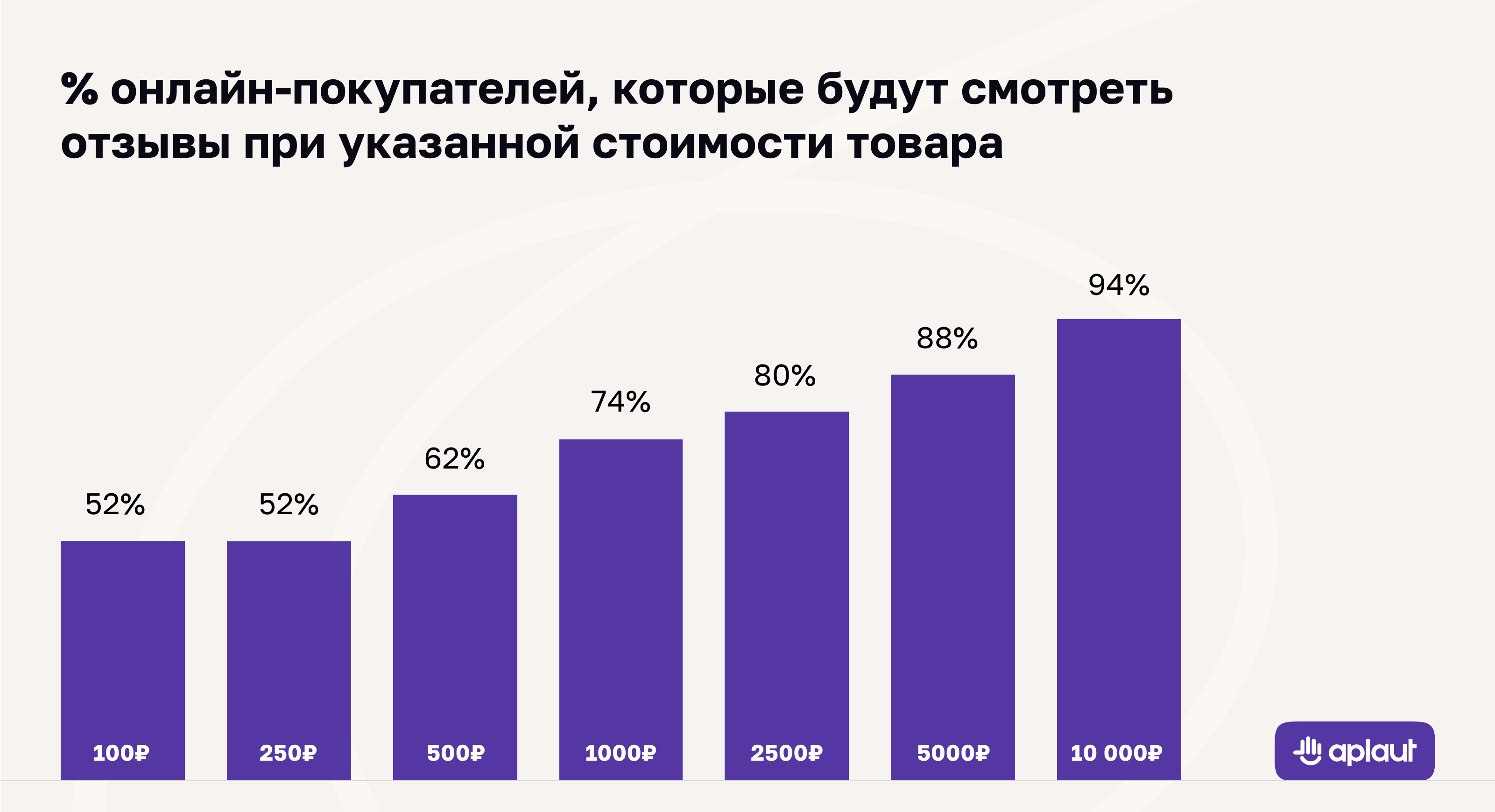 Четверо из пяти онлайн покупателей электроники и бытовой техники будут читать отзывы на товар при его стоимости выше 2 500 рублей. При стоимости товара выше 10 000 рублей – 94%.