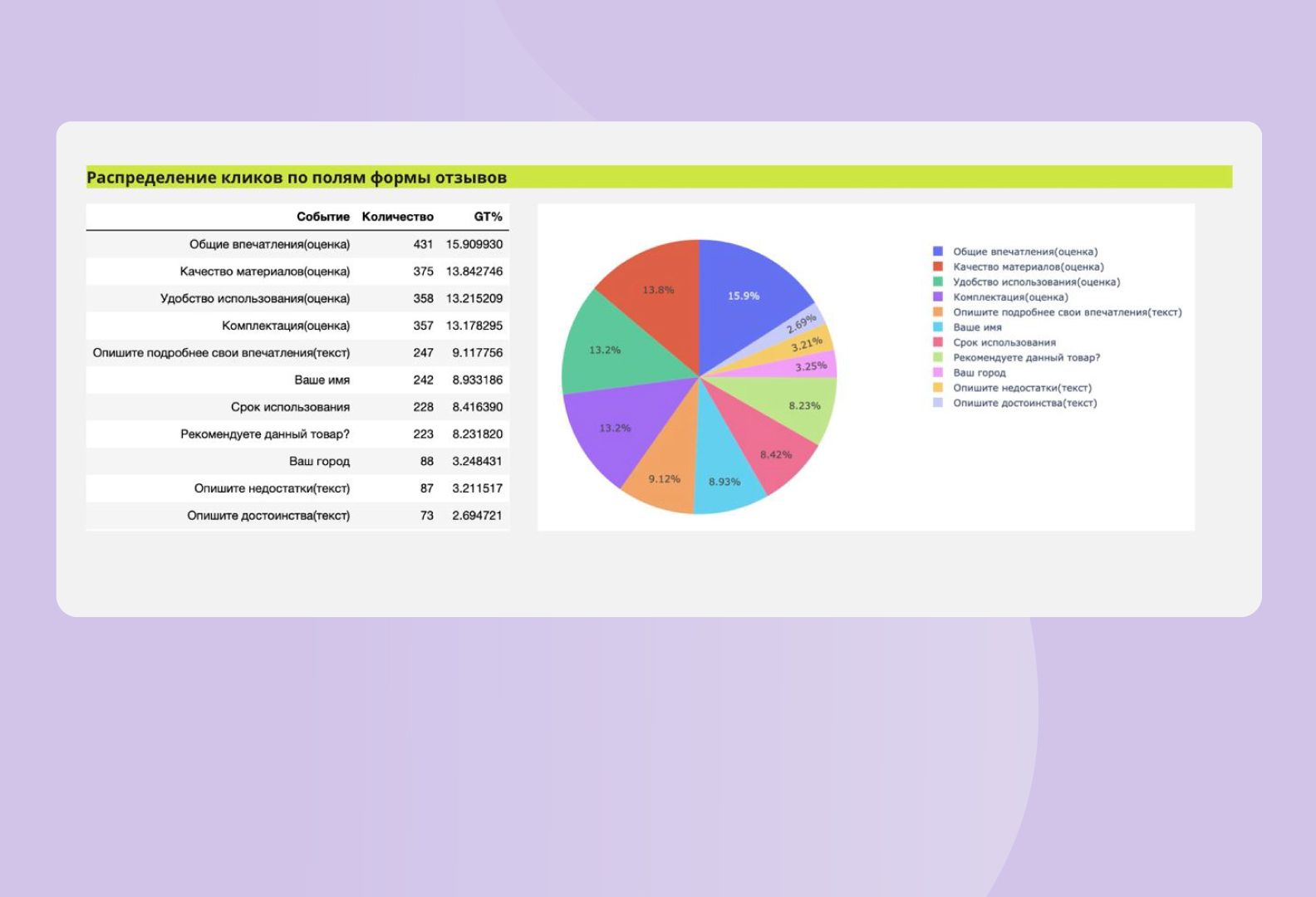 По задаче клиента мы также настроили дополнительные события по взаимодействию пользователя с виджетом отзывов на сайте через вебхуки: прокрутка до виджета, клик по кнопке «Оставить отзыв», отправка отзыва. По ним клиент может детально отслеживать в Google Analytics, как именно пользователь взаимодействует с виджетом.