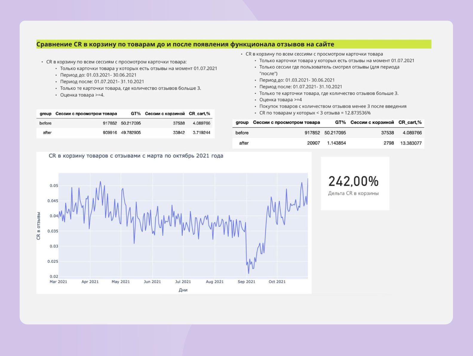 Конверсия в корзину после подключения отзывов на товары выросла с 4% до 13%.