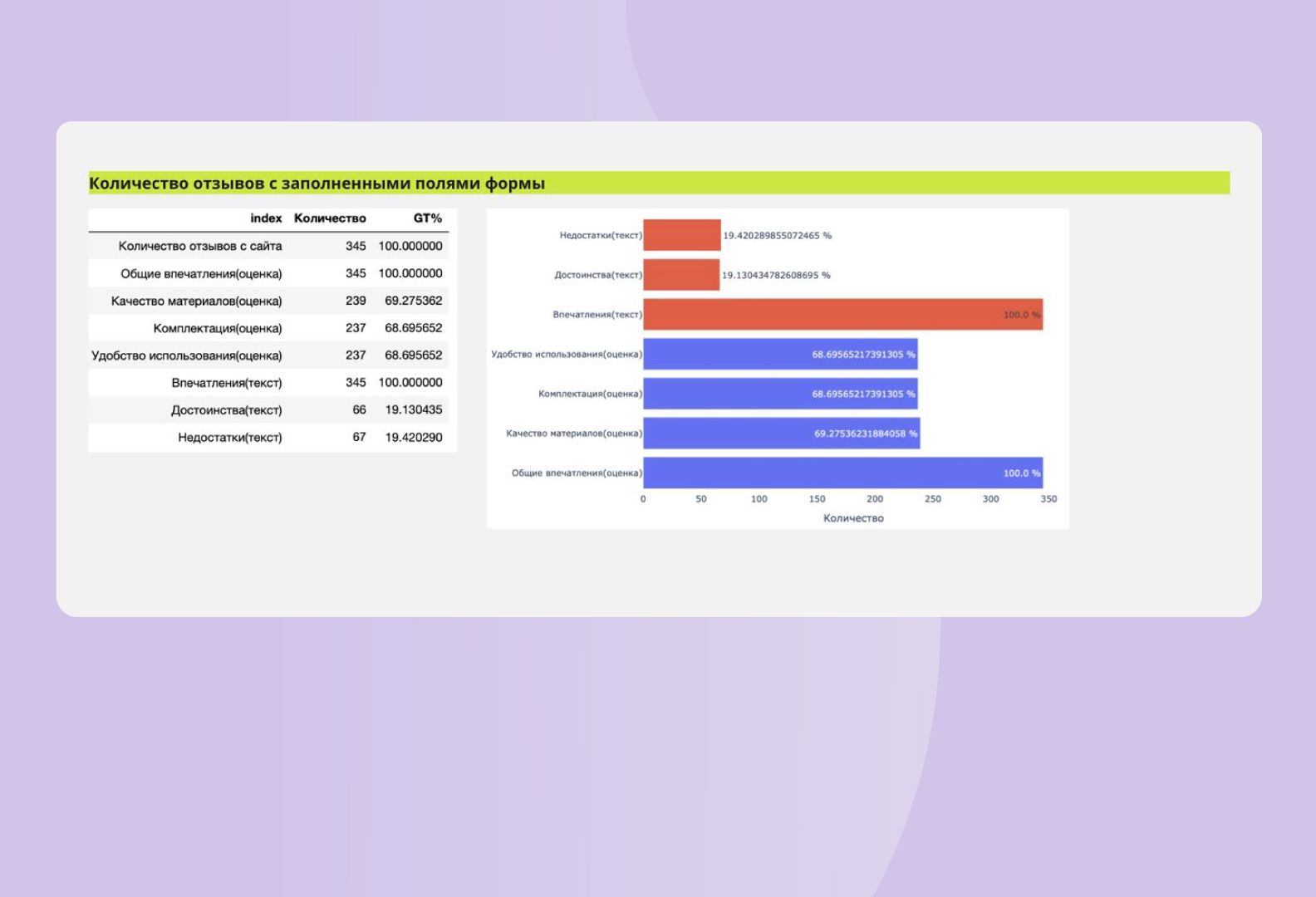 На старте работы с отзывами о товарах в компании столкнулись с проблемой: в отзывах, которые клиенты оставляют непосредственно на сайте компании (по собственной инициативе, а не через рассылку), доля негативных отзывов была очень высокой – 50%. После проведенных исследований в компании упростили форму для сбора отзывов: убрали все лишние поля, оставив только самые необходимые (чтобы пользователей не отталкивала перспектива заполнять больше количество полей для того, чтобы рассказать о своих впечатлениях о товаре). В результате удалось увеличить долю положительных отзывов до 61%.