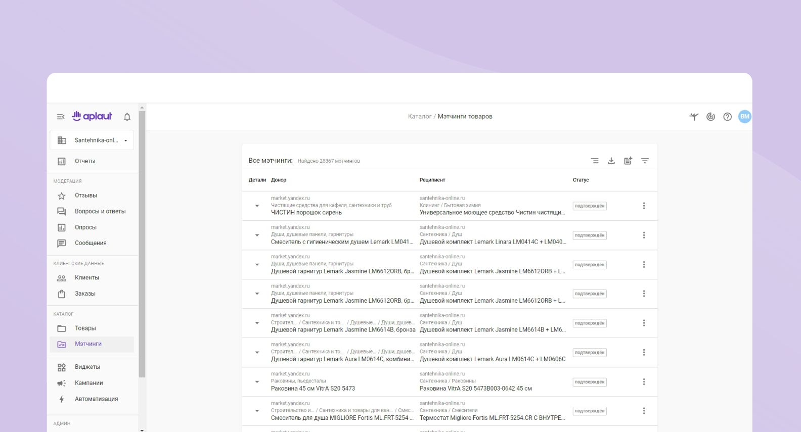 …и сопоставили (смэтчили) с товарами на маркетплейсе. Теперь все отзывы на нужные товары клиента поступают в личный кабинет клиента на Aplaut.