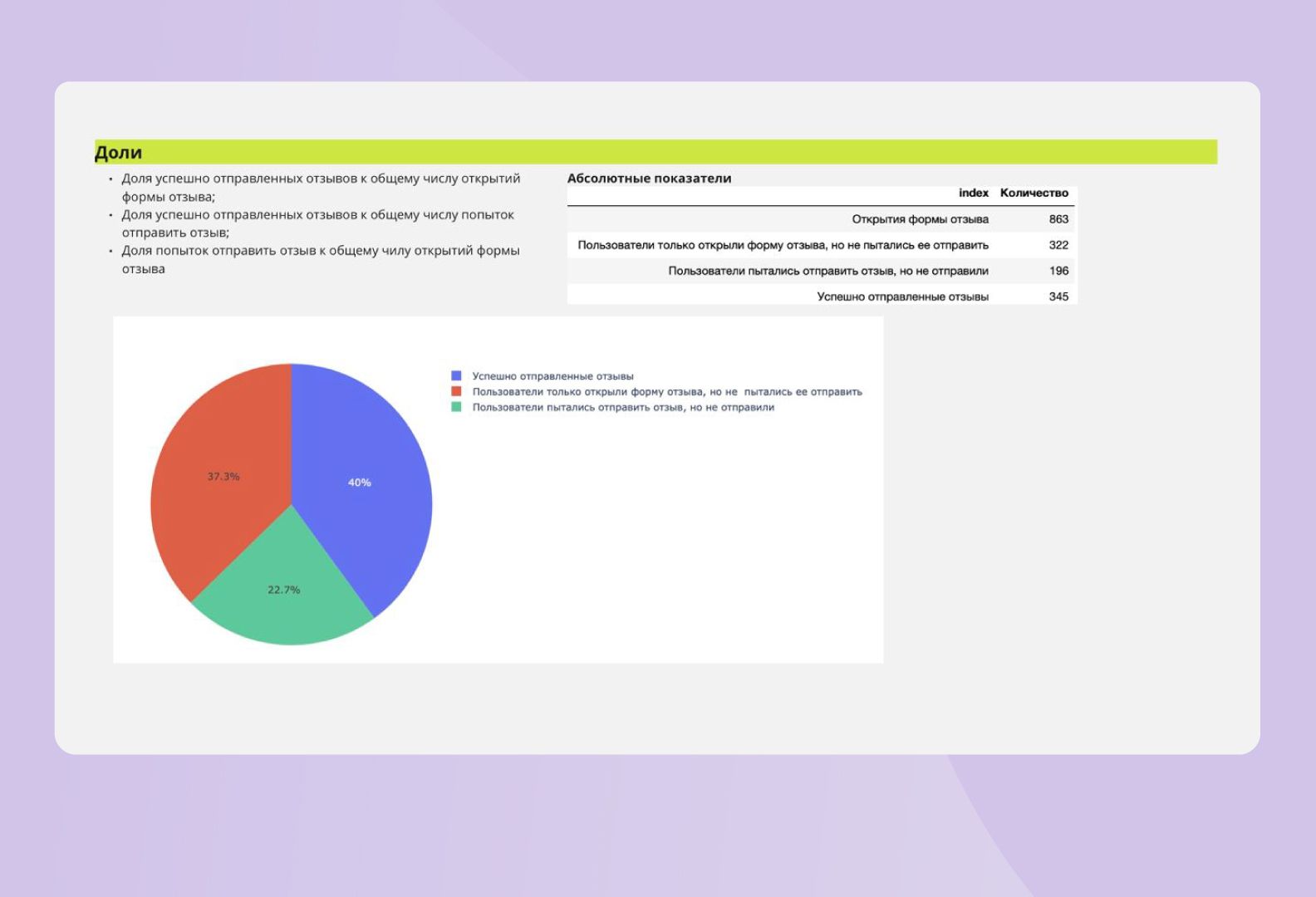 Доля успешно отправленных отзывов к общему числу открытий формы составила 40%.