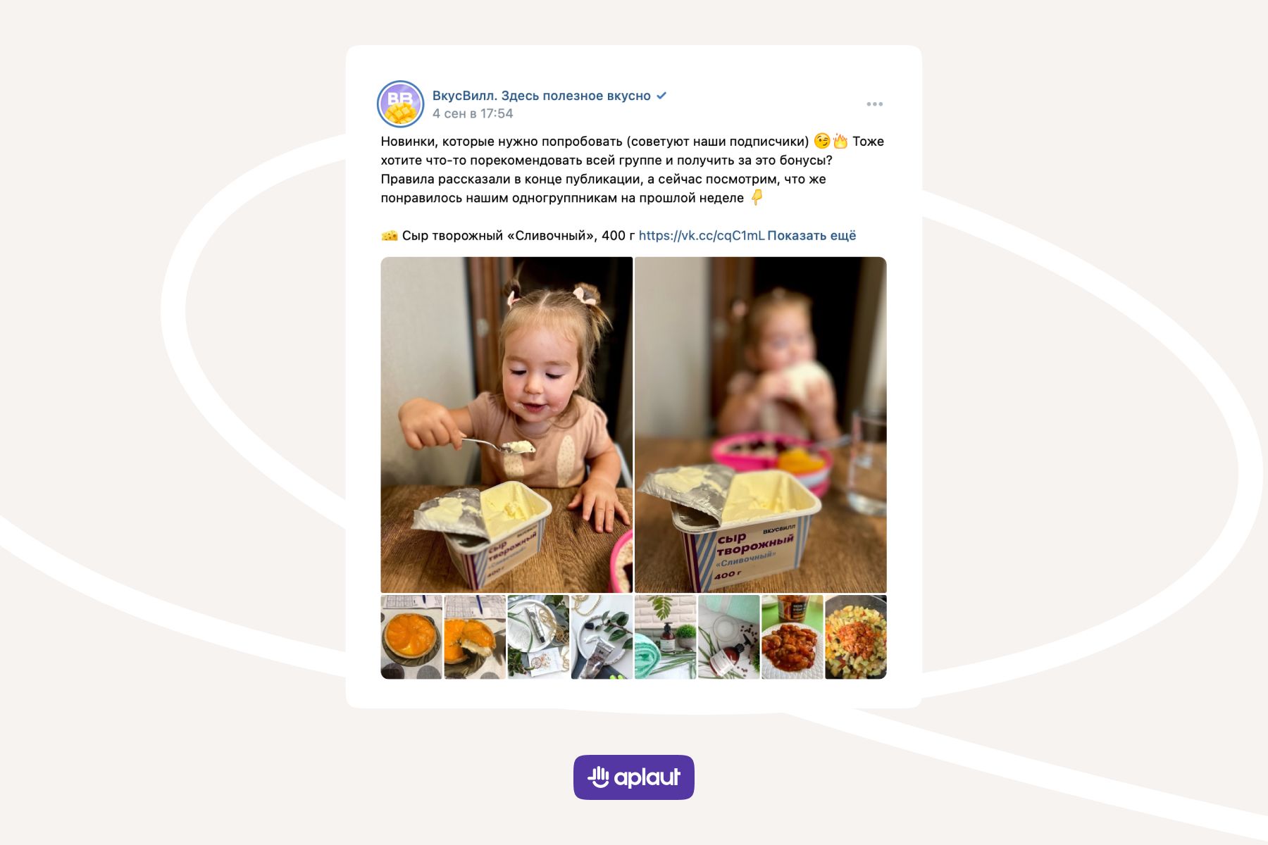 Компания «Вкусвилл» мотивирует своих подписчиков оставлять рекомендации и делиться советами в соцсетях за бонусы.