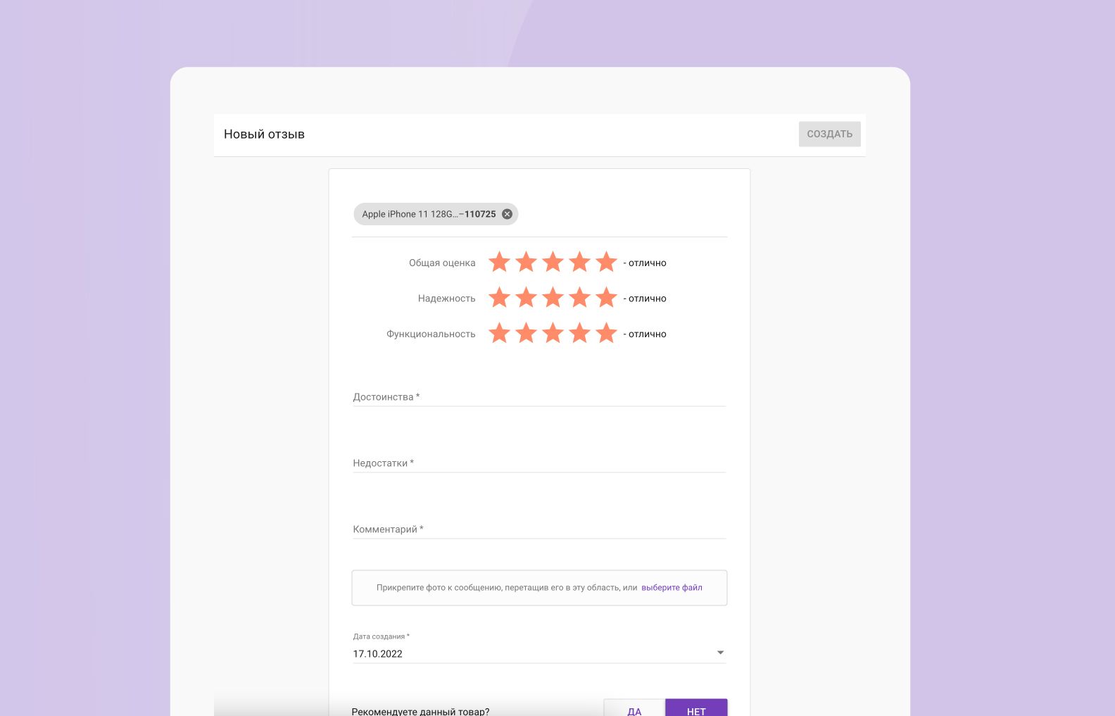 Теперь в разделе «Отзывы» можно создавать новые отзывы на товары из каталога с помощью формы и публиковать их в соответствующей карточке товара.