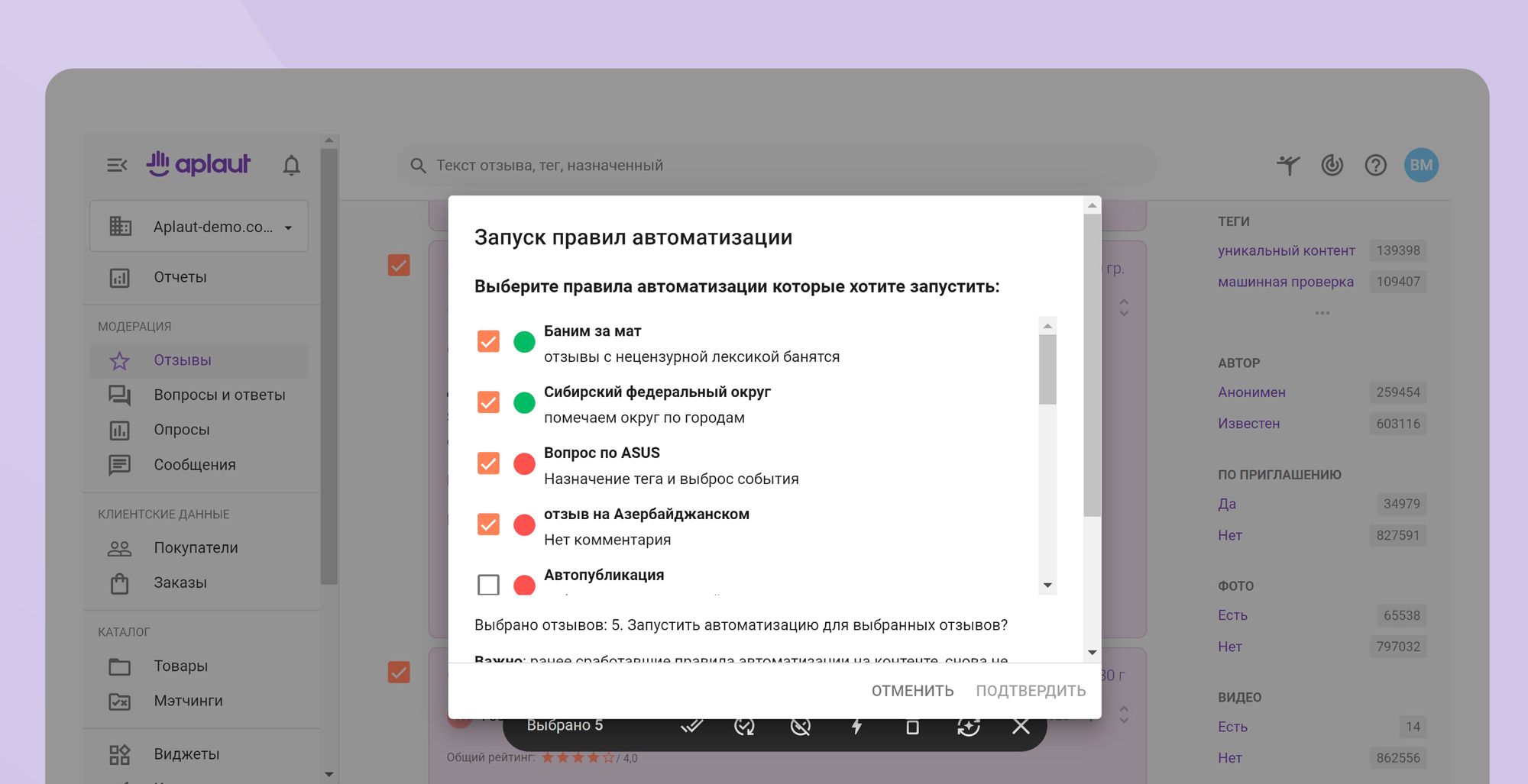 Правила автоматизации обработки отзывов можно запускать выборочно