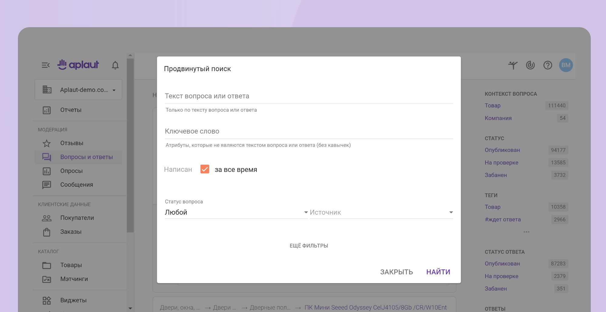 Удобный функционал продвинутого поиска теперь работает в разделе «Вопросы и ответы». Можно искать не только по ключевым словам в тексте, но и выставлять фильтры для контента по параметрам времени, тегов, статуса, источника, категории, бренда, продукта, а также просматривать контент отдельных модераторов.