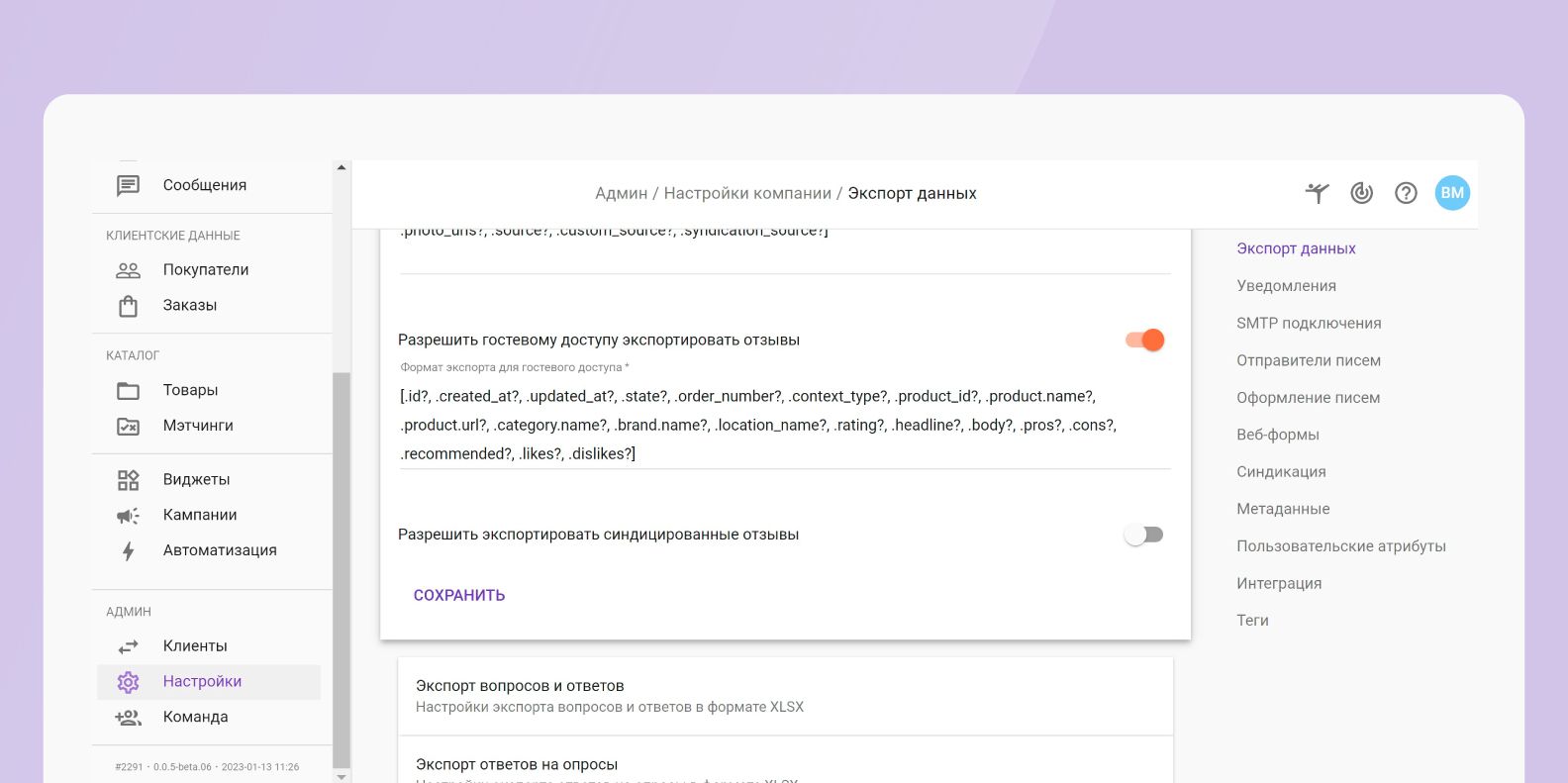 - Пользователю с гостевым доступом компания может разрешить экспортировать отзывы из личного кабинета с учетом выбранных фильтров. Это позволит мерчантам оперативно выгружать данные для аналитики в один клик, без обращения к компании.