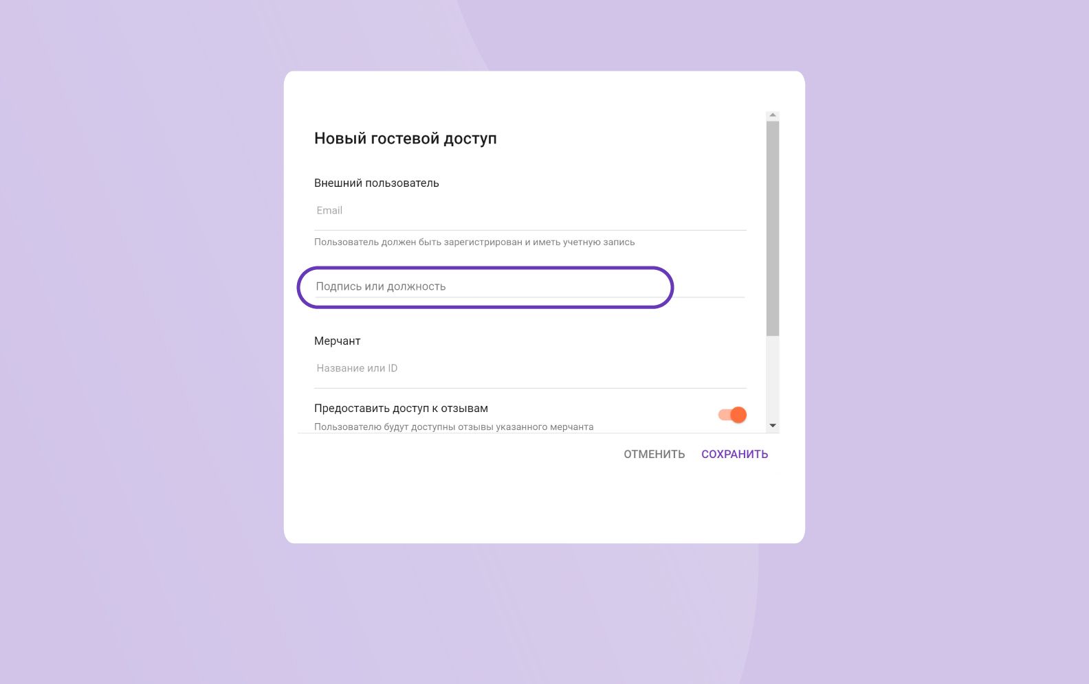 - При создании/редактировании гостевого доступа, компания может указать подпись/должность мерчанта. Если подпись указана, то она используется для новых комментариев. Это позволяет кастомизировать представление экспертов, отвечающих на отзывы и вопросы на разных площадках. В отсутствии указанной подписи она подгружается из профиля пользователя, и будет одинаковой на всех площадках.
