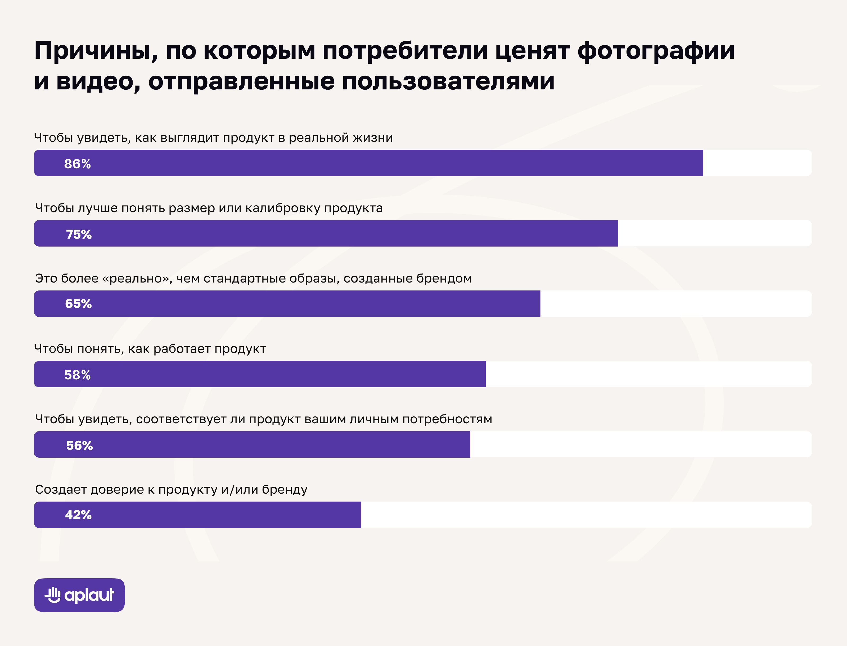 Сейчас почти каждый покупатель хотя бы иногда ищет отзывы с пользовательскими фотографиями, а 72% отмечают, что именно такой контент им больше всего хочется видеть в интернет-магазинах.