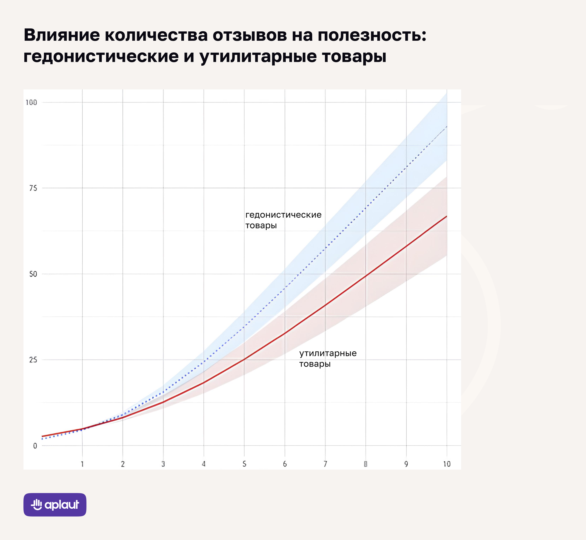 Для гедонистических товаров (одежда, парфюмерия, косметика, украшения) при 10 отзывах с фото — рост пользы колоссальный, для утилитарных (электроника, бытовая техника) — рост поменьше, но тоже значительный. Очевидно, что пользовательские фото оказывают более выраженный эффект на товары, которые оценивают по внешним признакам и с большей долей эмоциональности.