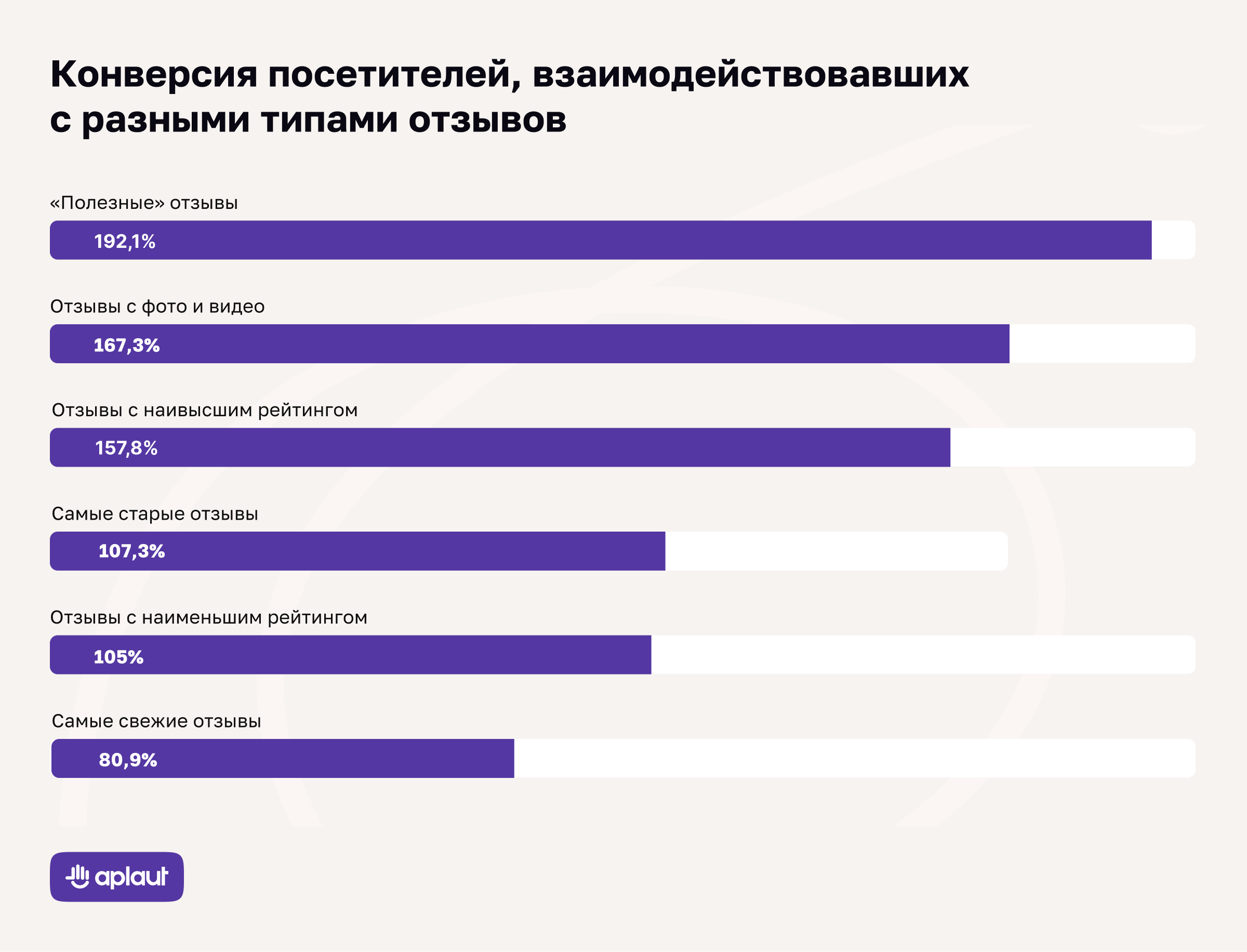 Согласно другим исследованиям: полезность отзыва — чуть ли не главное, на что смотрят люди до покупки. Коэффициент конверсии увеличивается на 314,7% среди тех, кто сортирует отзывы по «полезности».