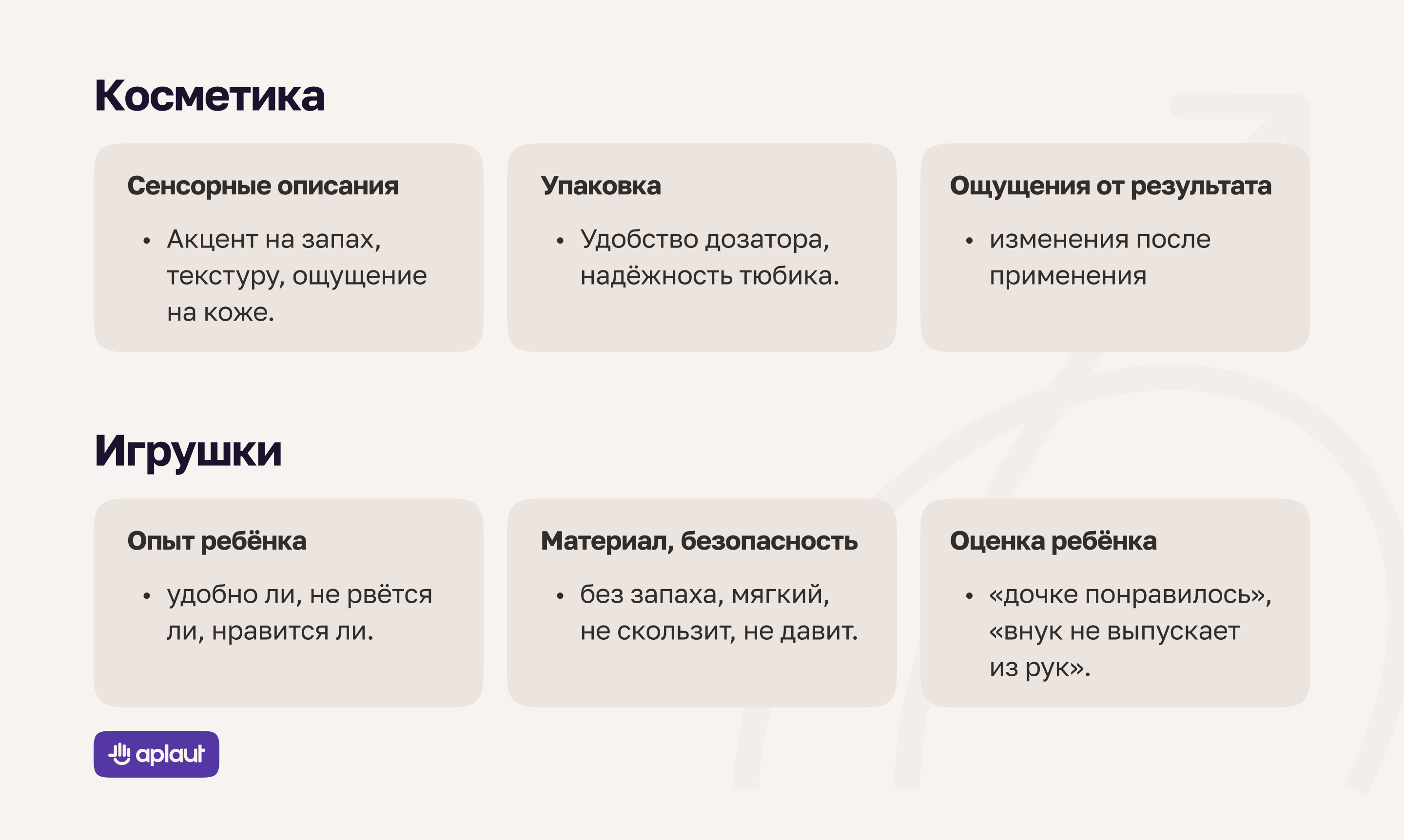 Чем больше в отзыве информации о реальном использовании товара, тем он более полезен. Мы выяснили, какие детали особенно важны для покупателей. Оказалось, для всех товаров в рамках одной категории существует универсальный набор. Например, выбирая игрушку, люди всегда обращают внимание на ее мягкость и на то, понравилась ли она ребенку.