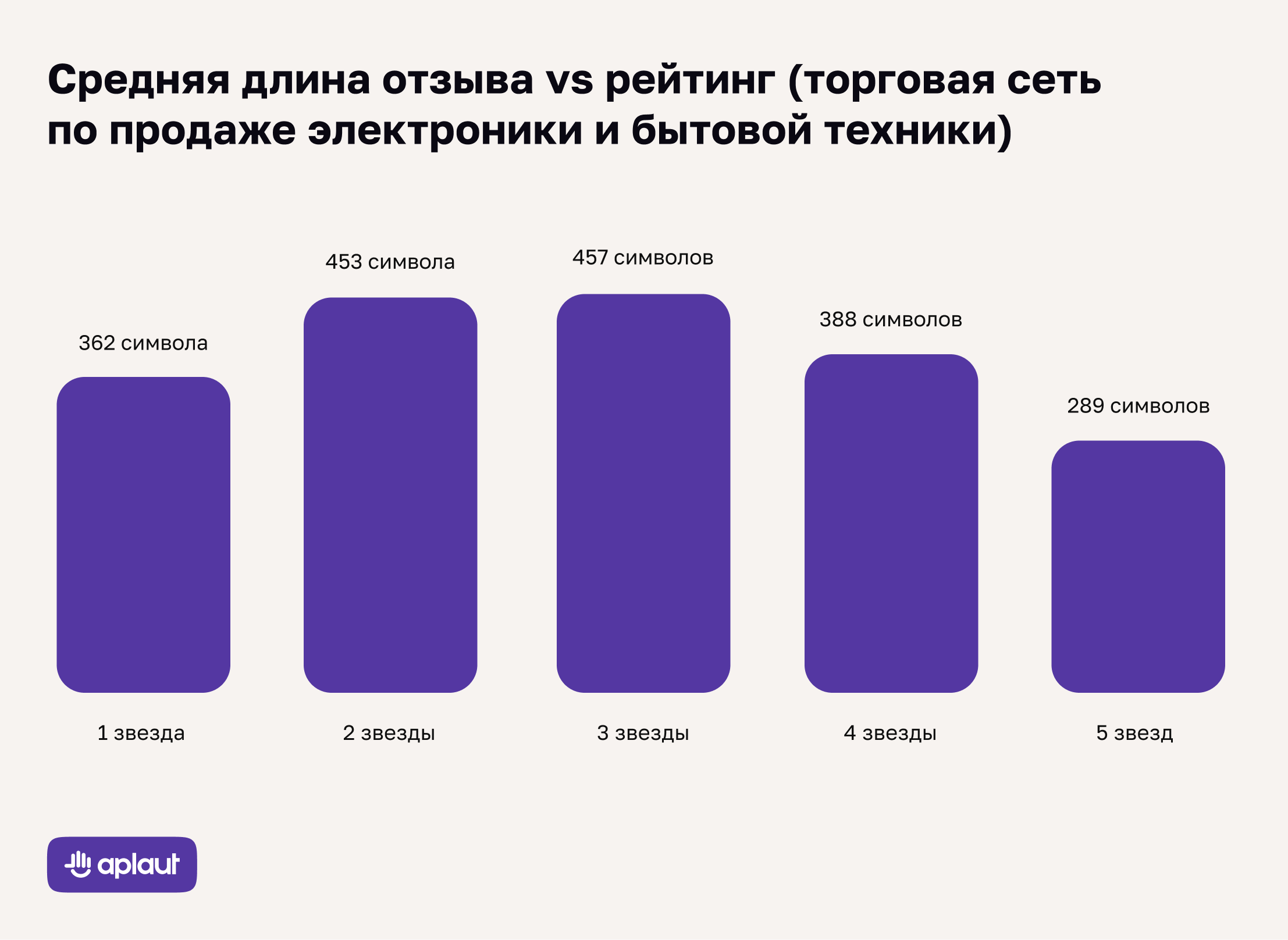 Подтверждают закономерность наши исследования на основе 700 000 отзывов. В среднем одну, две и три звезды получают объемные обзоры. Четыре, пять — короткие.