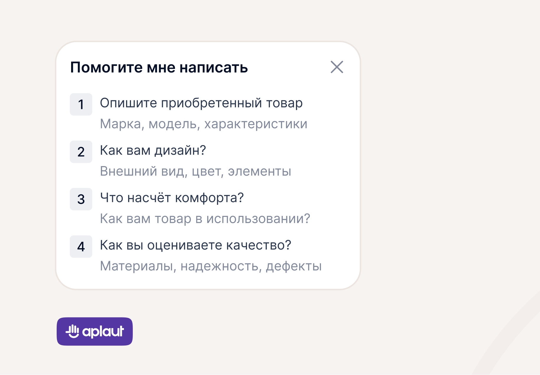 Добавьте блок «Помоги мне». Часто покупатели не знают, что написать в отзыве. Поэтому они с благодарностью воспользуются подсказками. Вопросы для подсказок могут меняться в зависимости от категории товара.