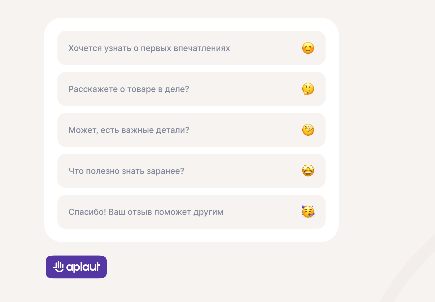 Еще лучше — сделать подсказки динамическими, как у Aplaut. Когда человек пишет отзыв, он не остается один на один с пустым полем. Перед ним появляются контекстные фразы. Они помогают структурировать мысли и вдохновляют на более подробный отзыв.