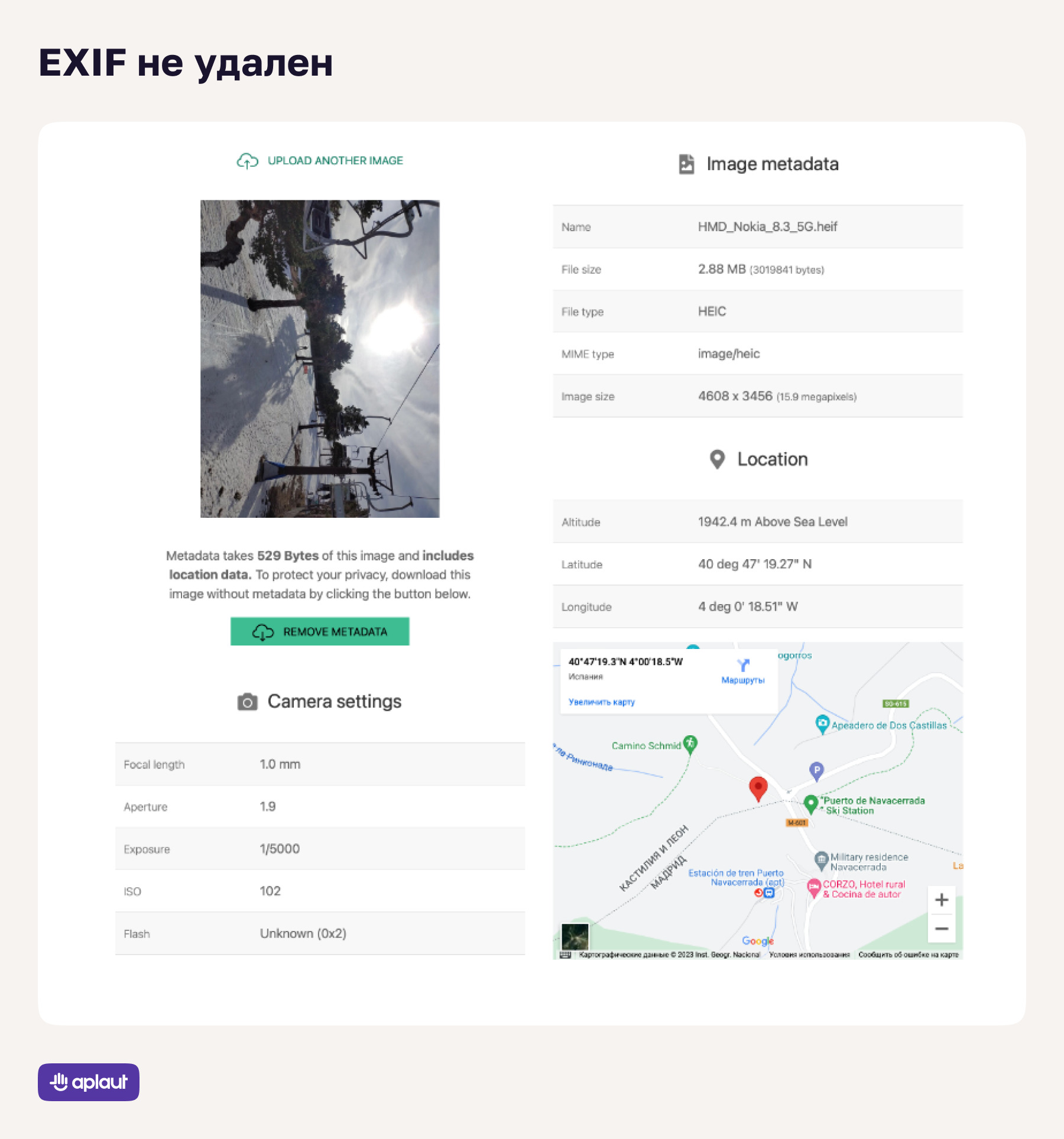 Согласно DLBI и Kaspersky Digital Footprint Intelligence в первые четыре месяца 2023 г. произошло 75 утечек из российских коммерческих компаний и госорганизаций. И, конечно, речь идет прежде всего, о персональных данных. В любом фотоконтенте может хранится информация о геолокации внутри EXIF*. Если после загрузки на сервер не удалить эту информацию, она будет доступна для широкого круга пользователей. Например, вот в этом сервисе можно загрузить фото из отзыва и узнать геолокацию пользователя, потому что данные EXIF не были удалены.